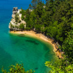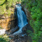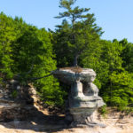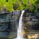For another day long adventure, we left the camper about 11 a.m. headed for Pictured Rocks National Lakeshore (some 2 hours away on the UP). We had reservations for the 5 p.m. boat tour and thought this departure time would give us time to explore the park. We stopped at the Visitor Center upon arrival but it was closed due to renovation. The park ranger had a table outside the building where I was able to get my National Park Passport stamped. There are a number of hikes throughout the park. Bill and I elected to do two of the shorter ones – Munising Falls which leads to a 50 foot waterfall and Miners Castle Overlook for a view of Miners Castle and Lake Superior.