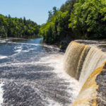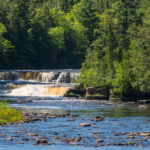 Rising from springs north of McMillan, the Tahquamenon River drains the watershed of an area of more than 790 square miles. From its source, it meanders 94 miles before emptying into Whitefish Bay. The amber color of the water is caused by tannins leached from the cedar, spruce and hemlock in the swamps drained by the river. The extremely soft water churned by the action of the falls causes the large amounts of foam, which has been the trademark of the Tahquamenon since the days of the voyager. — michigandnr.com
