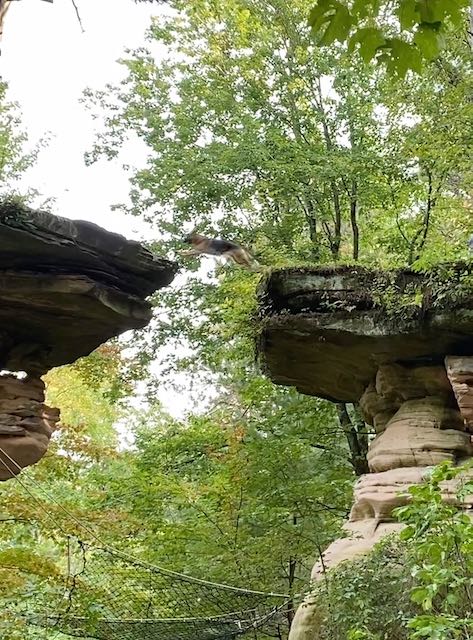 Going further afield, on one gorgeous day we drove to Devils Lake State Park in Baraboo. This 9000 acre park is one of Wisconsin’s most popular state parks. It contains a number of interesting rock formations and provides some great views from the Baraboo Bluffs. Only one problem. You had to negotiate some steep trails to see them. Bill decided he was up to the challenge so we walked together to the base of the Balanced Rock Trail. That’s where Bill started his upward trek as I continued on the level Grottos Trail. At the top of bluff, he was able to get a photo of Balanced Rock and Devil’s Doorway. He said the trail along the top was paved and level. He still had to come back down. His options included taking the 0.3 mile Potholes Trail or continuing along the East Bluff Trail and taking the 0.3 mile CCC Trail down. He chose the Potholes Trail where he rejoined me on the Grottos Trail.