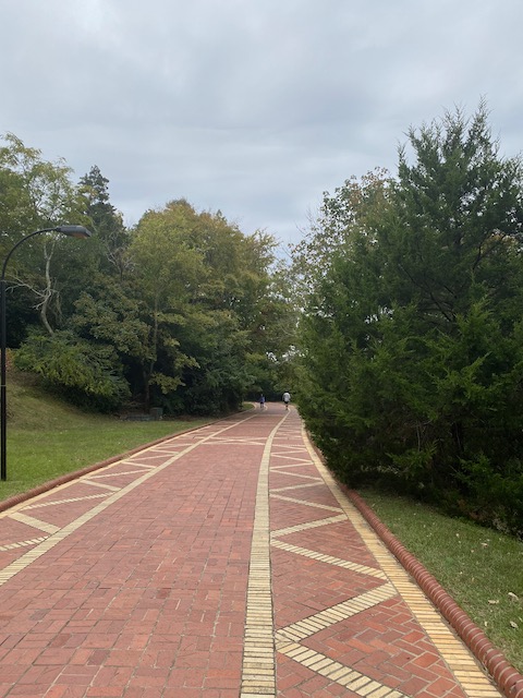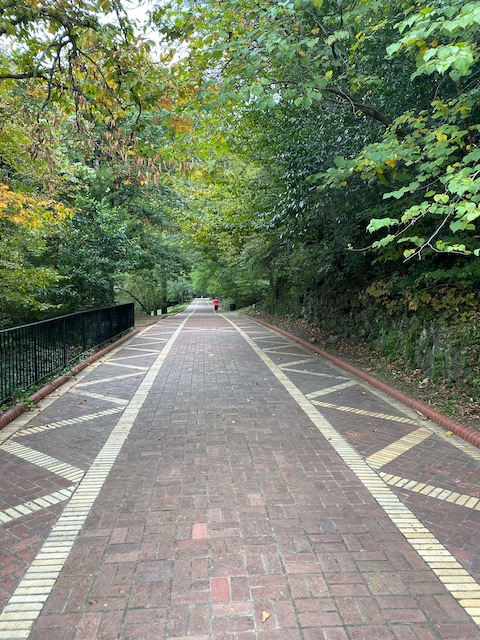 The Grand Promenade is now a National Recreation Trail. It runs on the east side of Bathhouse Row, behind Bathhouse Row, between Reserve Street and Fountain Street. It is between a quarter of a mile and a half-mile in distance, and it’s a brick walkway. It is sort of a complement to the Magnolia Promenade, the sidewalk that runs in front of Bathhouse Row. The Grand Promenade had its origins in some inspiration by an architect named Charles Peterson, who talked about the Prado, a pedestrian walkway in Havana, Cuba. So that was his inspiration, and they graded for the path. There was a roadway to the Tower and also a supply road back here, but they graded all that to an even level in the 1930s. They put bricks from the south end up to almost halfway, around the early 1940s, and for awhile the rest of it, going over toward Fountain Street, was just basically a gravel walkway. However, they did end up finishing the Grand Promenade in the late 1950s. They completely changed the south entrance, which had been a straight up-and-down staircase, with this almost spiral pattern, and then adding the staircase here. They also moved the Noble Fountain from its place closer to Central Avenue, toward a location just at the end of the Grand Promenade. The Grand Promenade features landscaped scenery. It has fountains, so that you can “quaff the elixir,” as they used to say of drinking the hot spring water, along the way. Exercise was part of the cure, but of course this was a social resort as well as a medical one. So you would certainly want to promenade in your finery, here at this great social resort, this great American spa. And if you wanted just to sit down and relax, this was a good place to do it. They even provided tables and seating, so that you could play checkers or chess along the way.