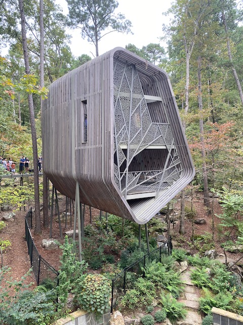 The next day we drove the Hot Springs Mountain Scenic Drive in the national park. The drive, originally built as a carriage road in the 1880s, starts at the end of Fountain Street off Central Avenue. It continues through a series of switchbacks until you reach the Pagoda overlook and the Hot Spring Mountain Tower. Since they were limiting the number of people in the tower (and gift shop), we took the short walk down to the Pagoda overlook instead.