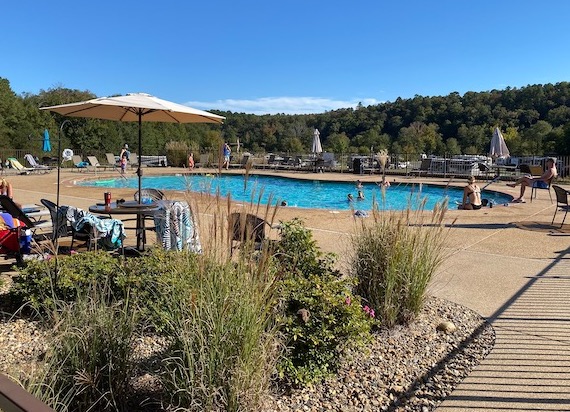 Our home base for the week was Catherine’s Landing an RVC Outdoor Destination. The DRV Owners Group had used this resort for a rally so we knew our rig would fit. The resort includes a heated saline pool, water frontage on Lake Catherine with boat rentals, a disc golf course, large pavilion, hiking trails, dog parks, a zip line, and fabulous sunsets.