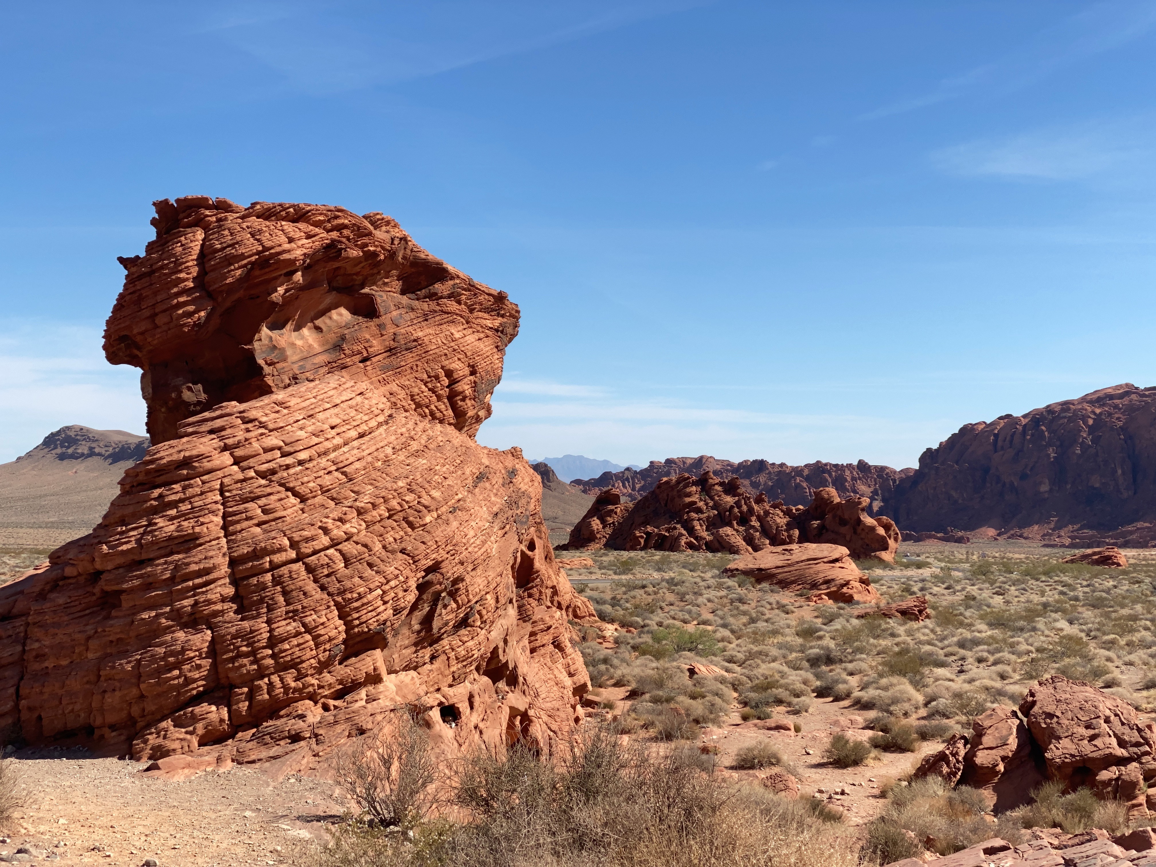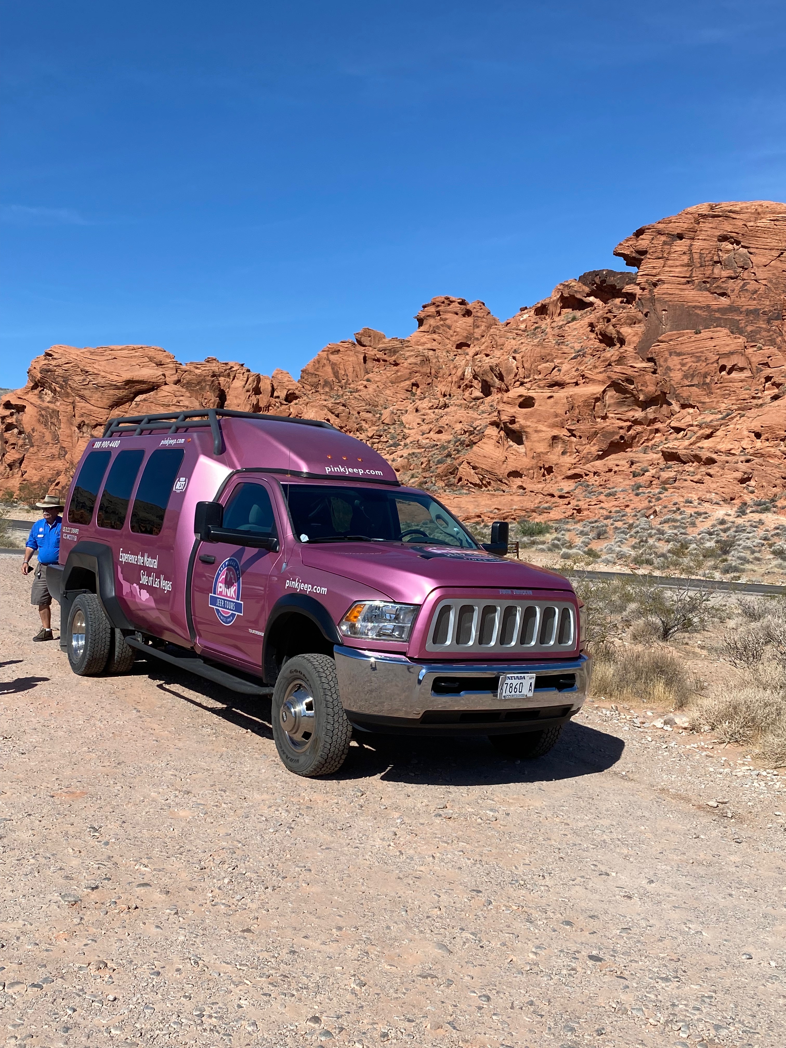 To give Bill a break from driving, we arranged a tour from Las Vegas to the Valley of Fire with Pink Jeep Tours. Our driver picked us up at the Oasis Office at 7:30 a.m. that morning. He made another stop at the South Point Hotel Casino to pick up another couple before heading out for the hour-long drive to the valley.
