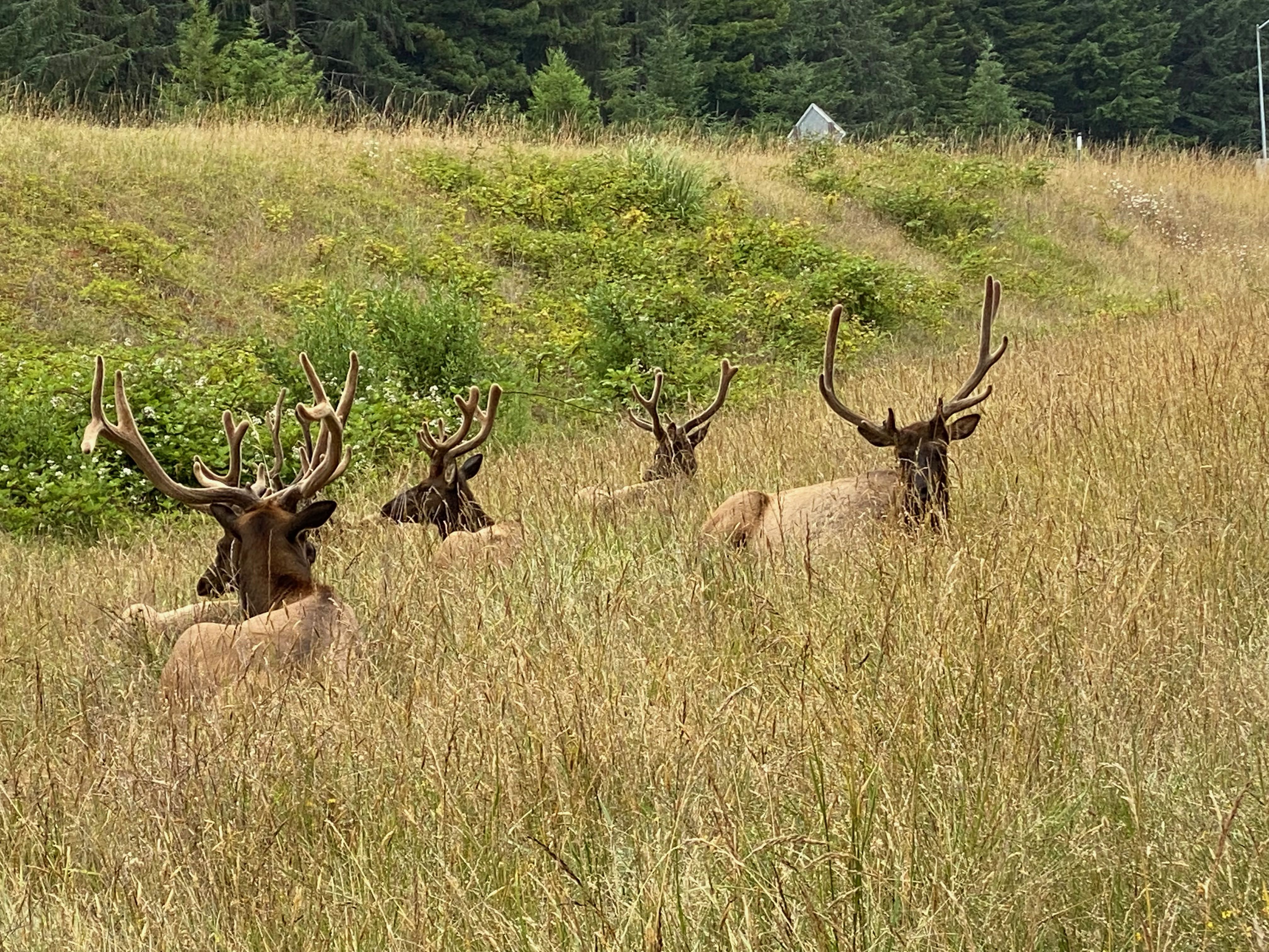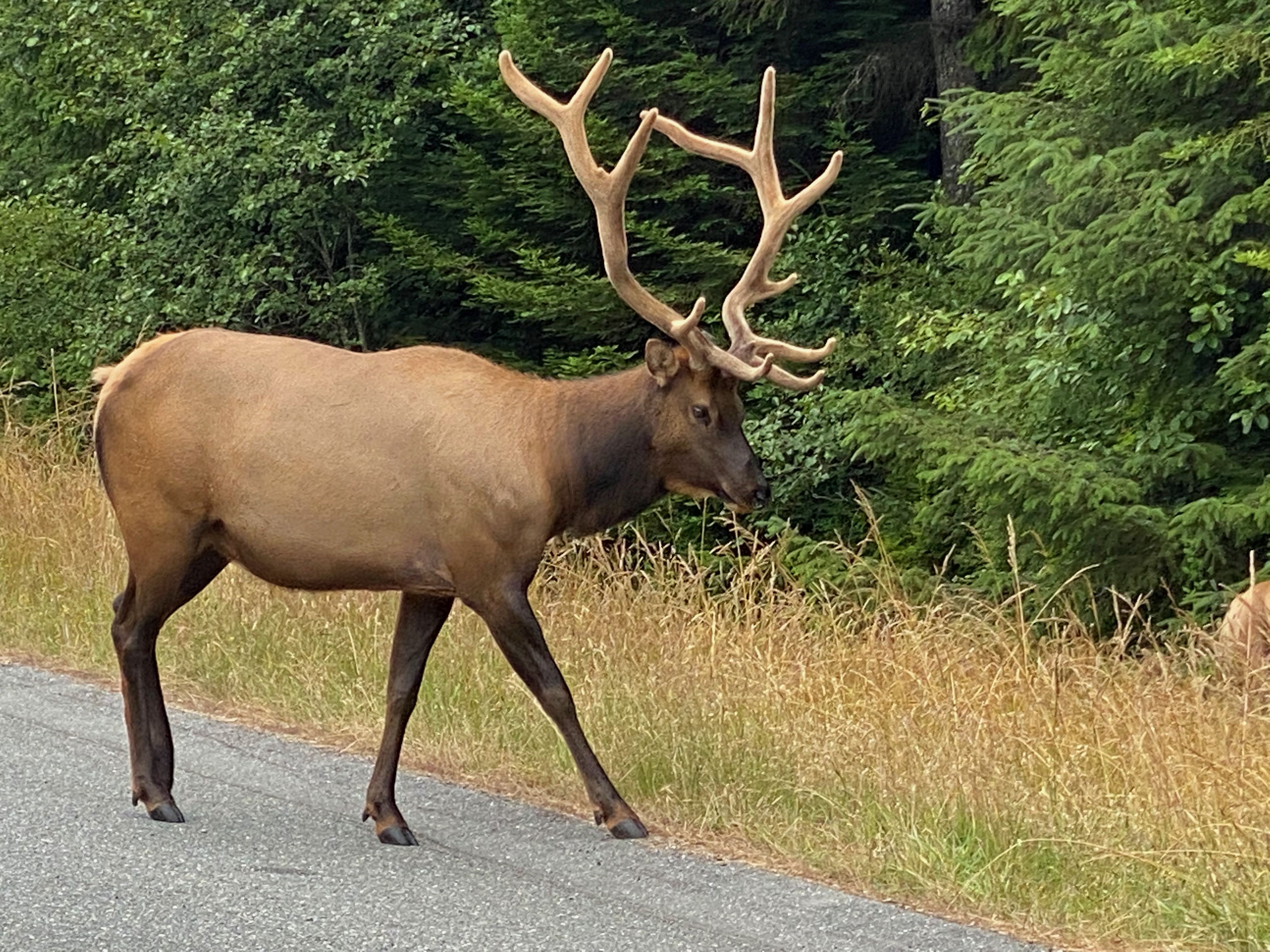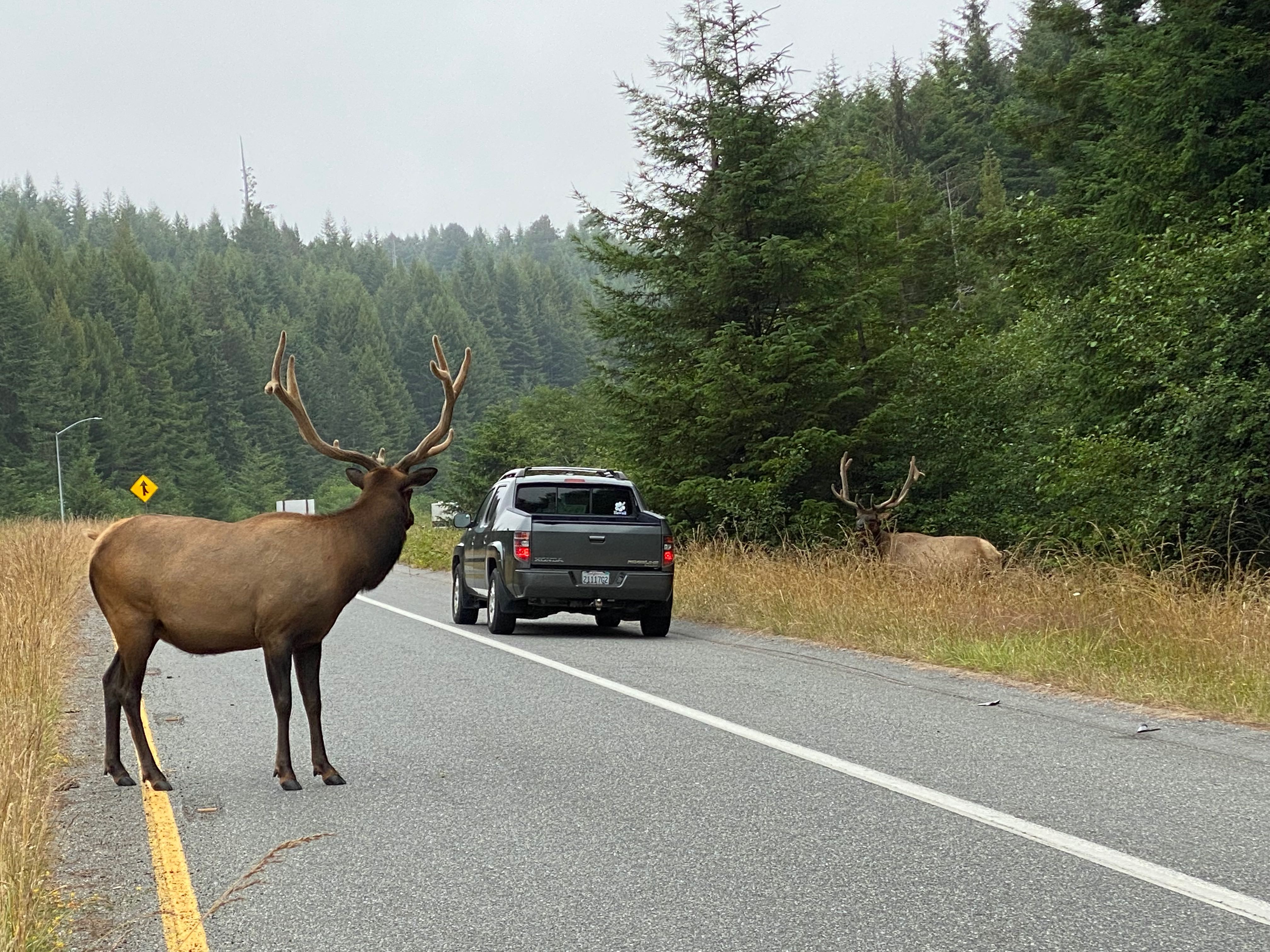 The next day was a bit unusual as the coastal fog didn’t lift in the morning. On a lark since it was still chilly, we decided to head down to Prairie Creek and the elk viewing area hoping to find elk. We didn’t get that far as we found some just off the highway!! These are Roosevelt elk.