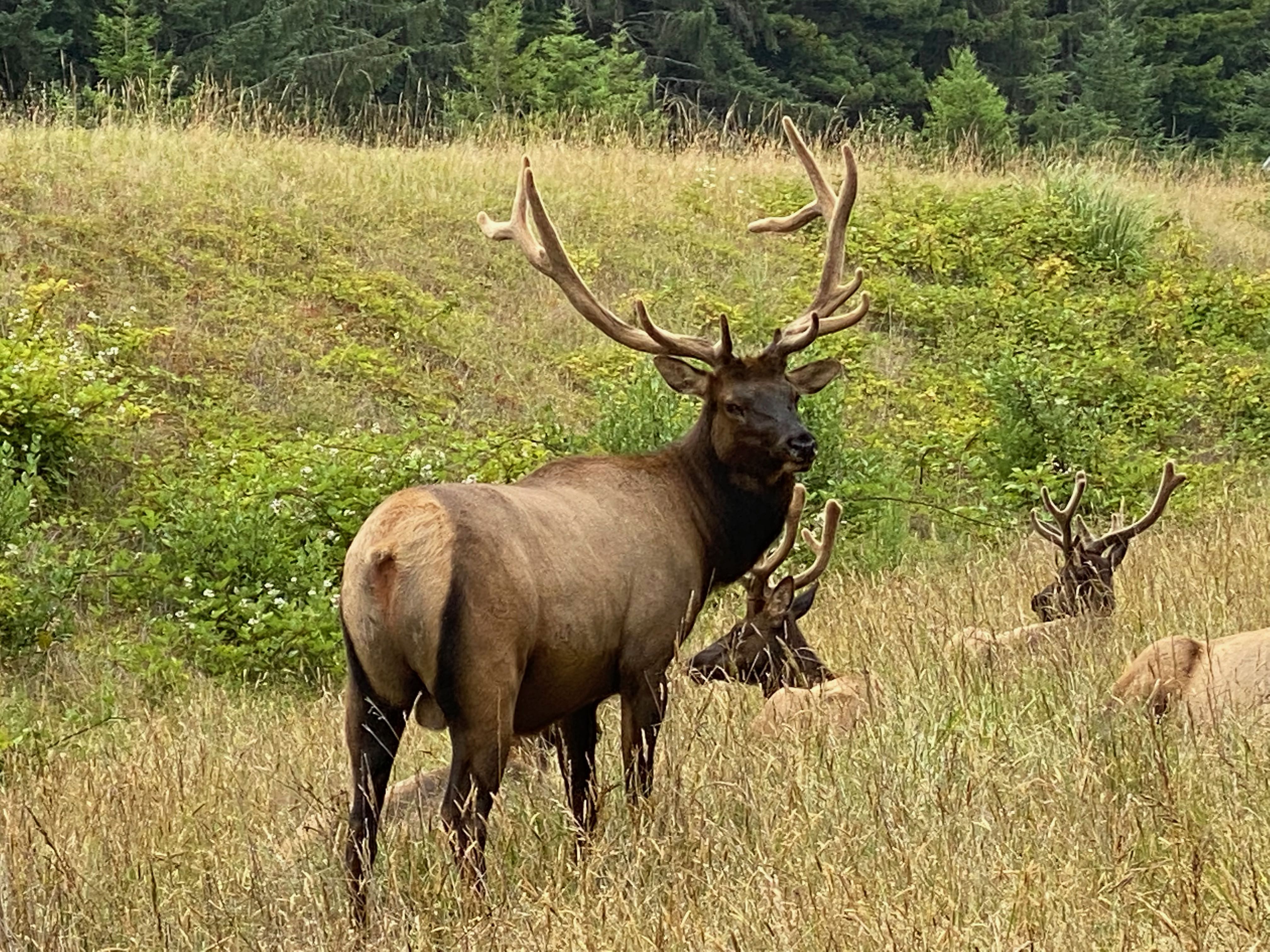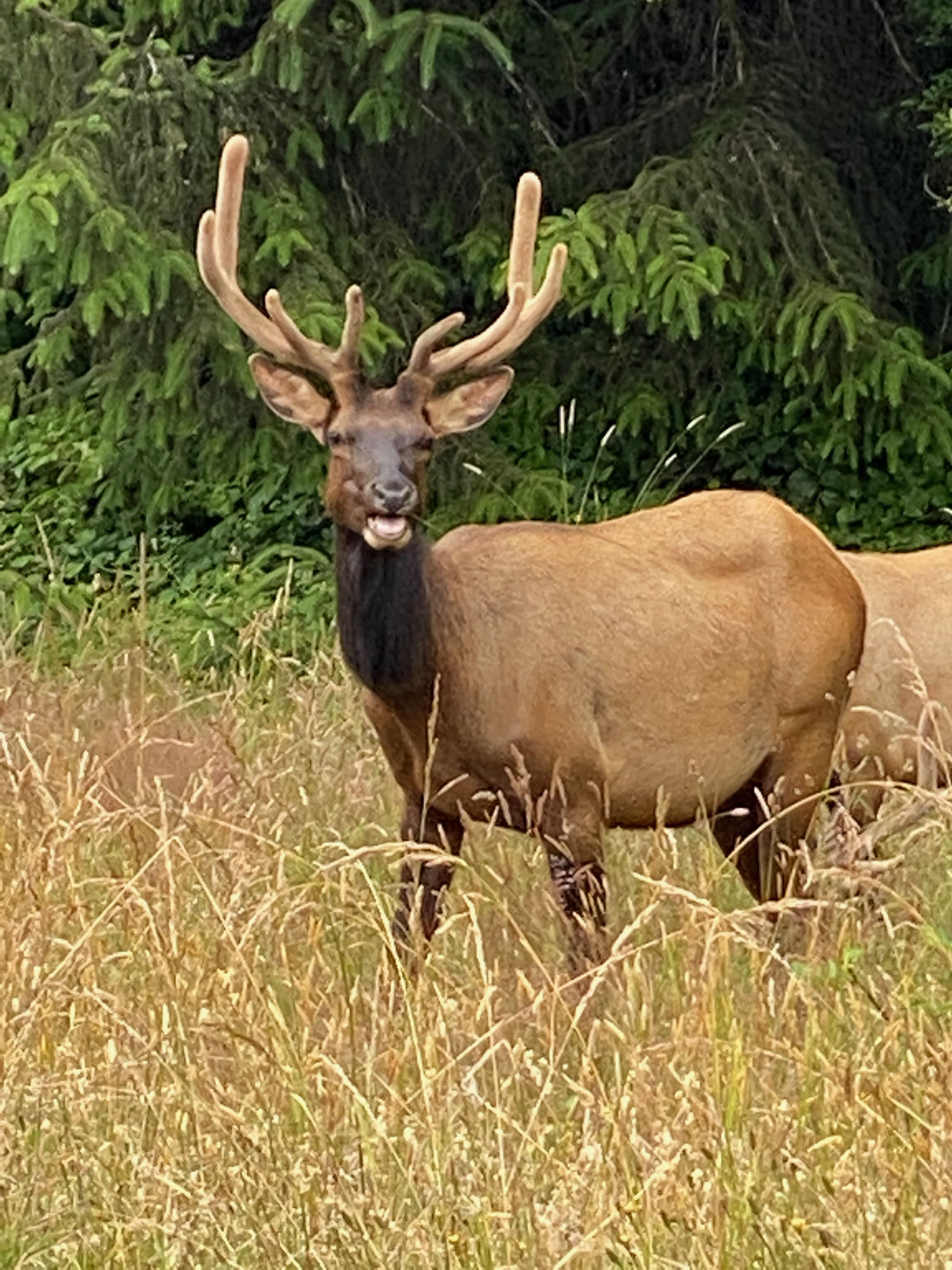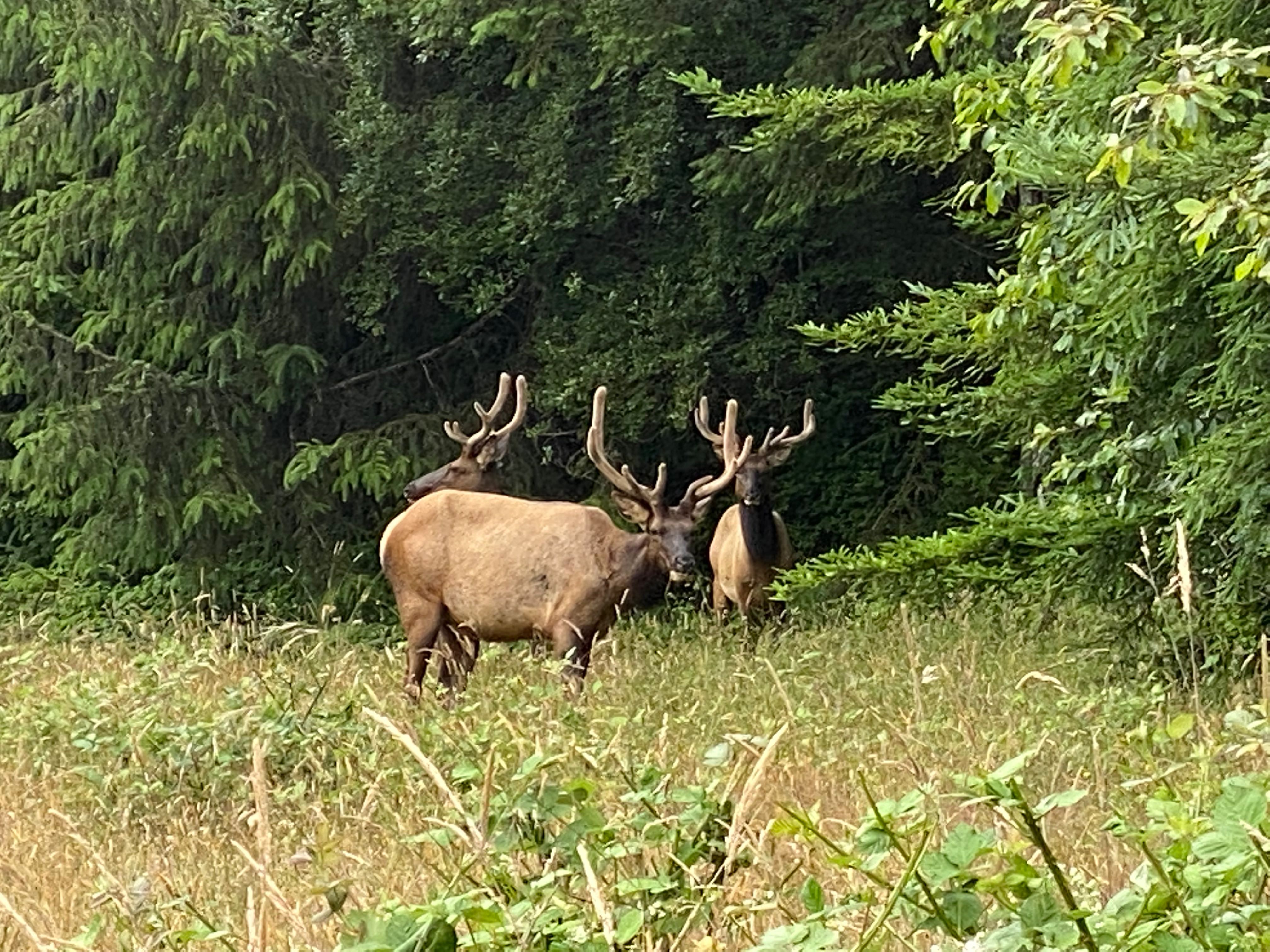 The next day was a bit unusual as the coastal fog didn’t lift in the morning. On a lark since it was still chilly, we decided to head down to Prairie Creek and the elk viewing area hoping to find elk. We didn’t get that far as we found some just off the highway!! These are Roosevelt elk.