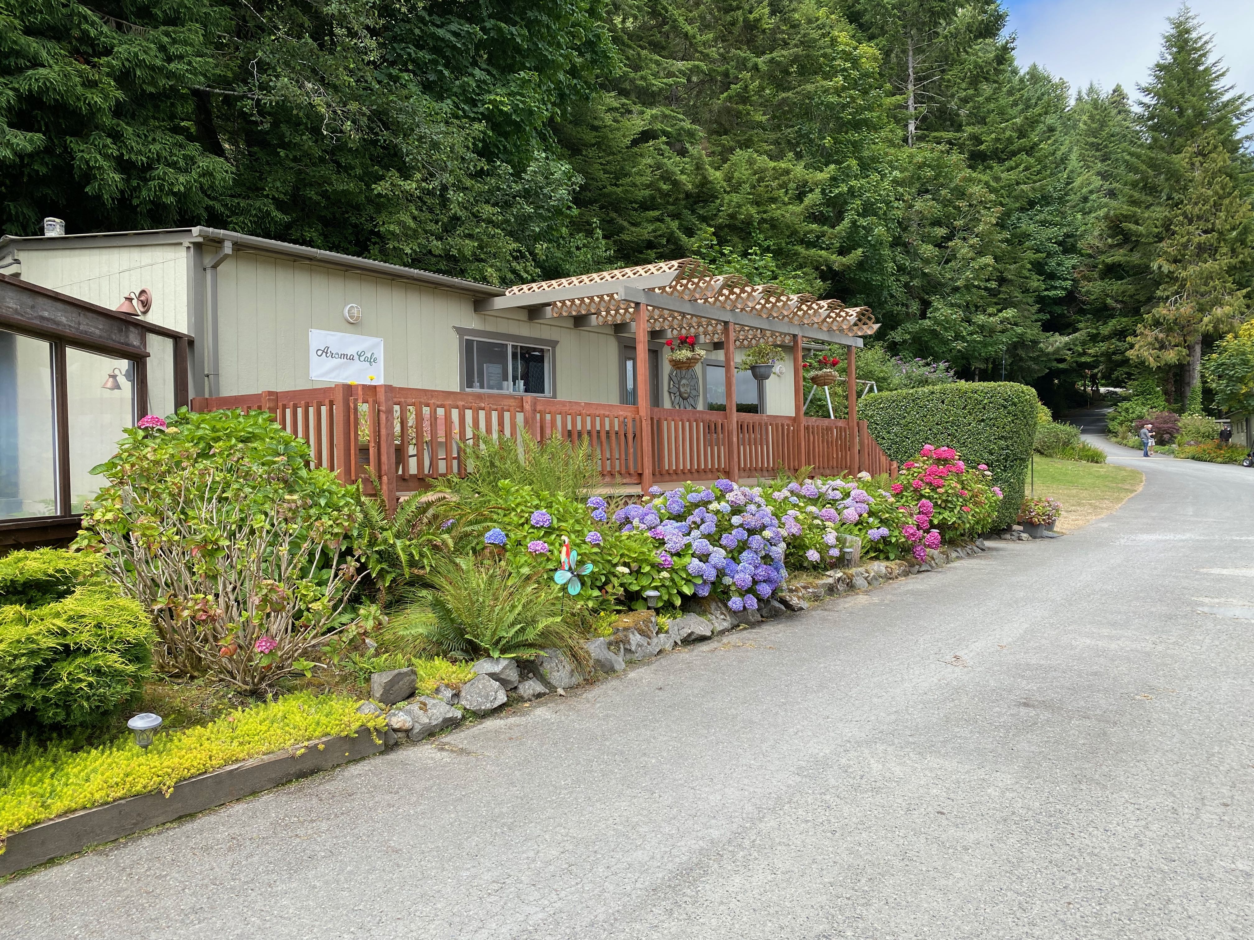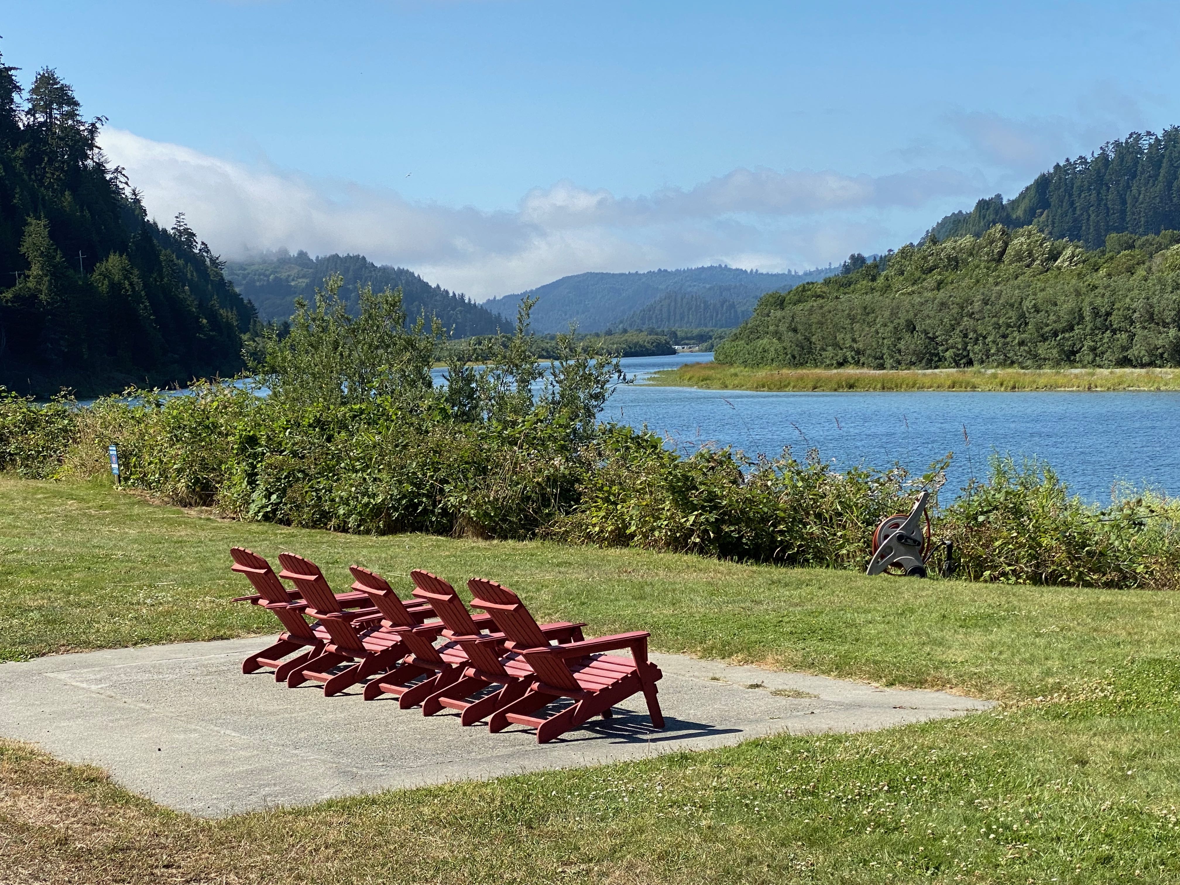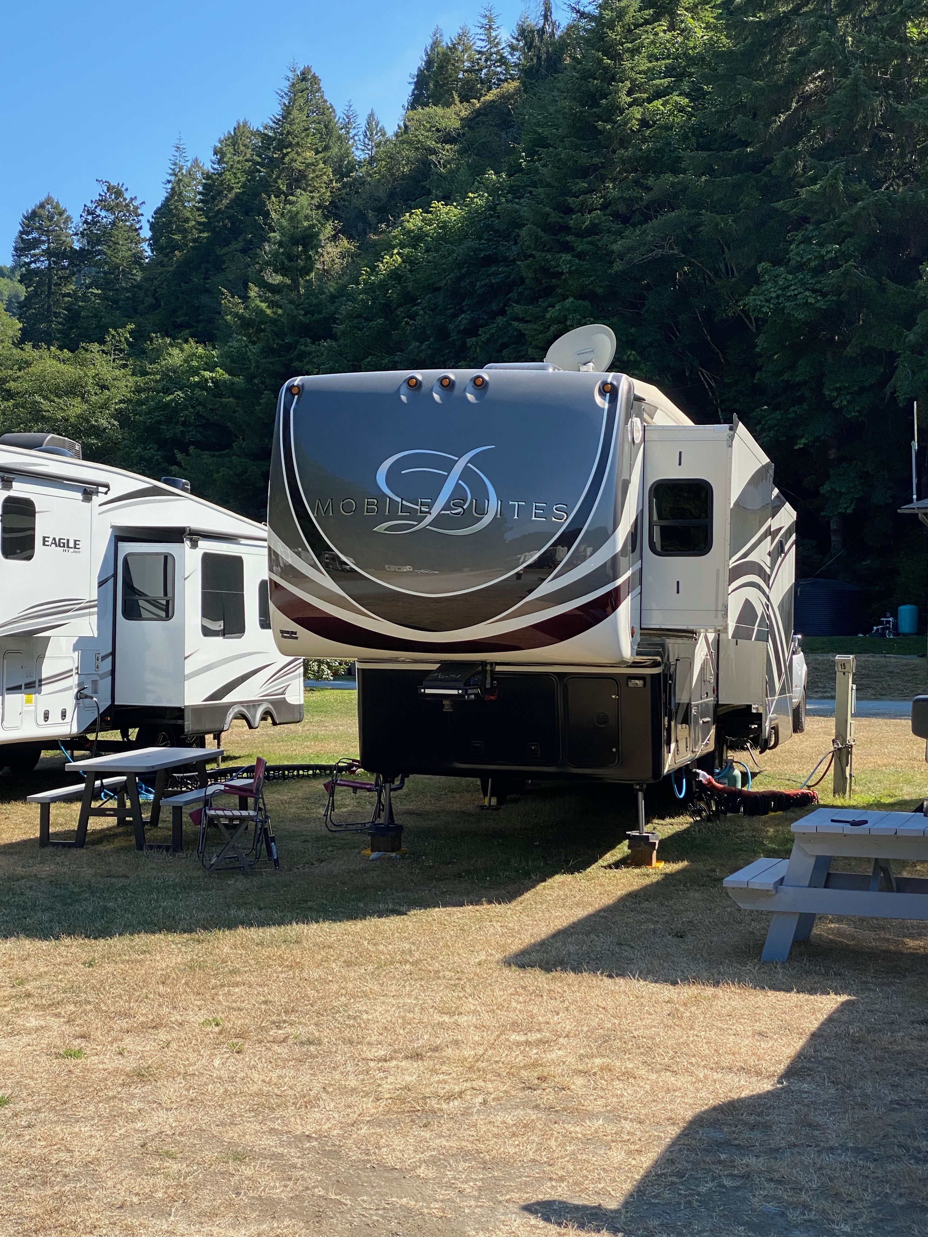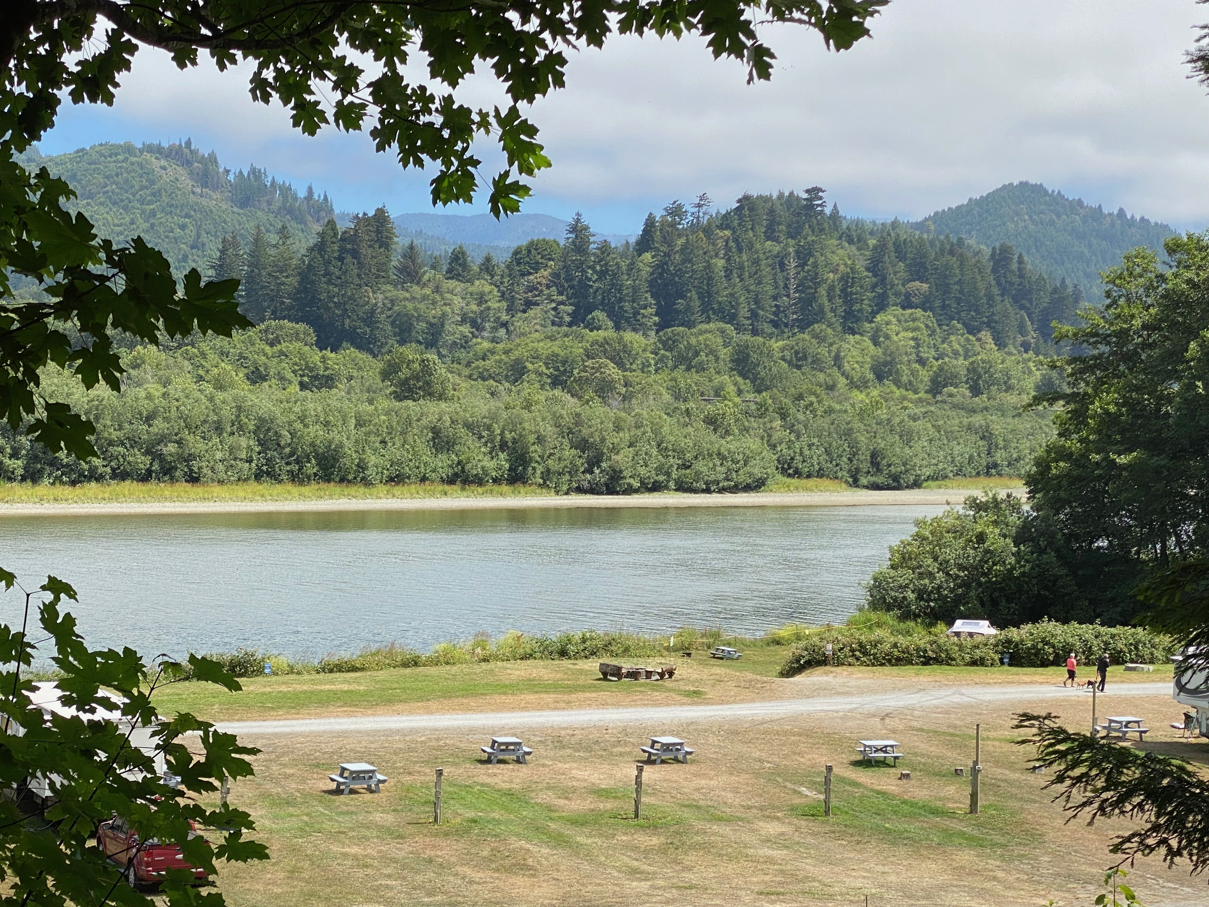 For our home base here we selected the Klamath River RV Park located on the banks of the Klamath River. Getting into the campground was a bit dicey as there is a hairpin downhill entry but Bill handled it with ease. Some of the sites are riverfront but we selected one further back. Our site was a long but rather narrow grassy site. We didn’t have a neighbor for the first couple of days which we really enjoyed as that gave us a nice living space. Unfortunately, that changed in the middle of the night when a fifth wheel squeezed in next to us.
