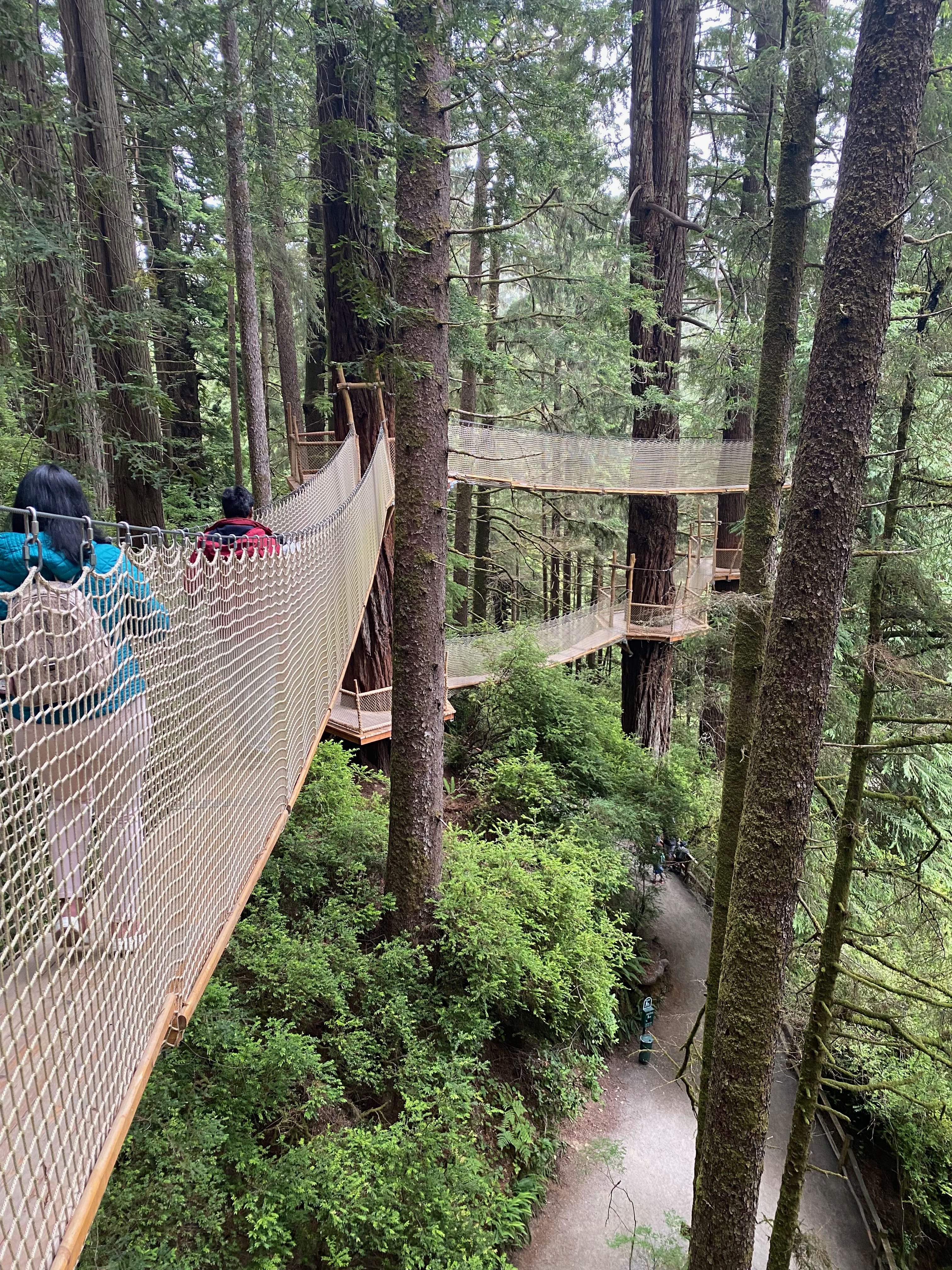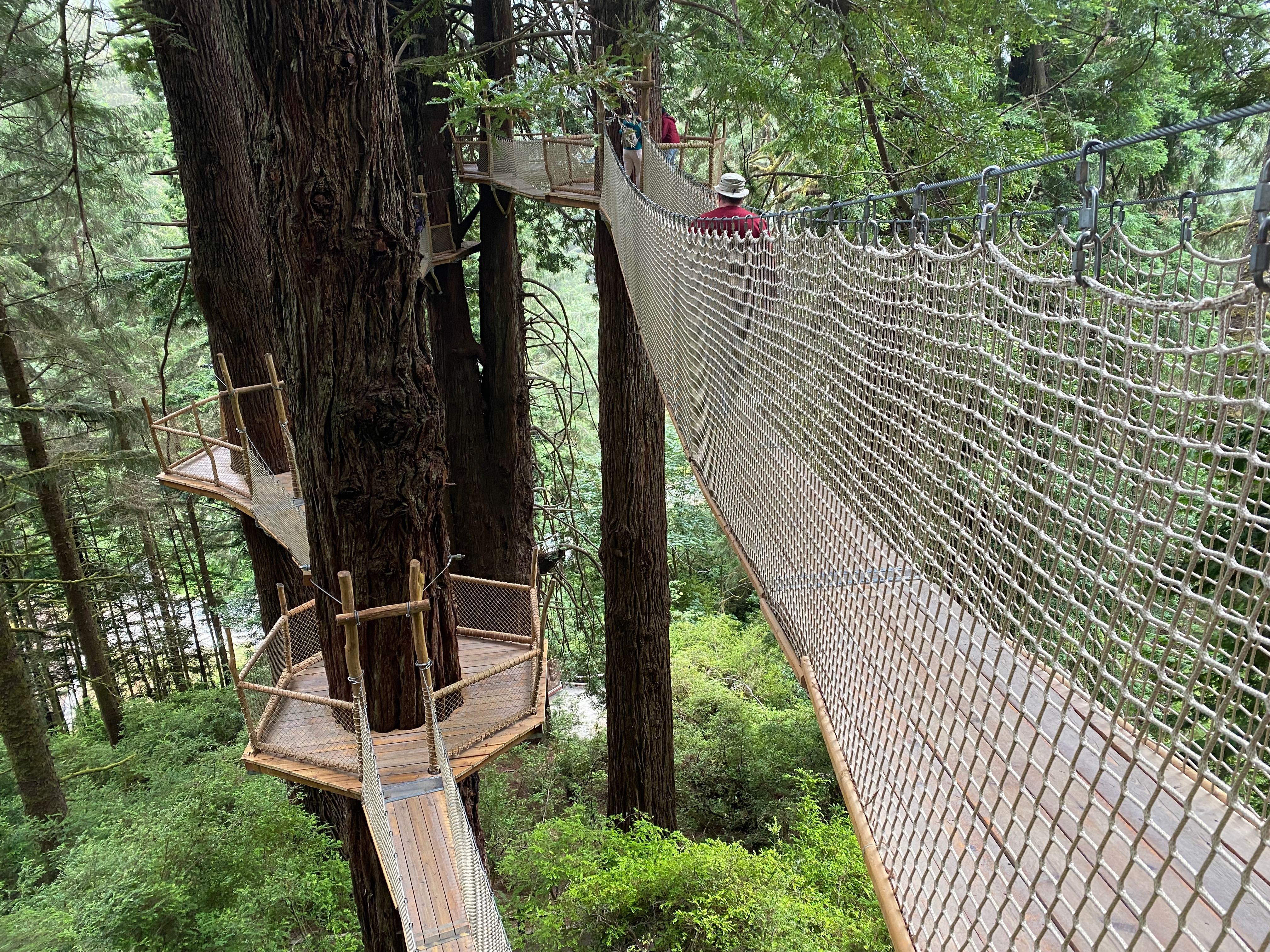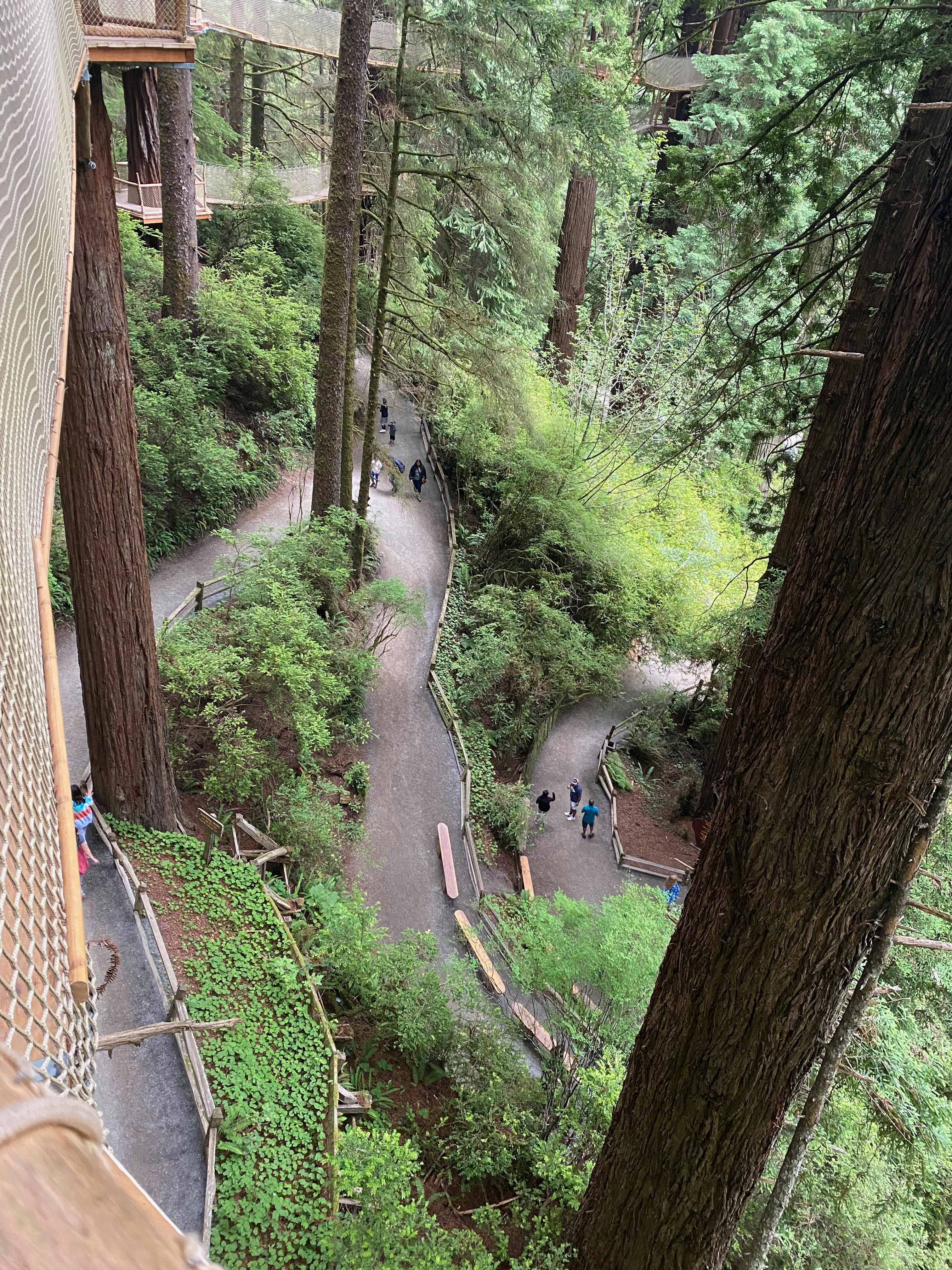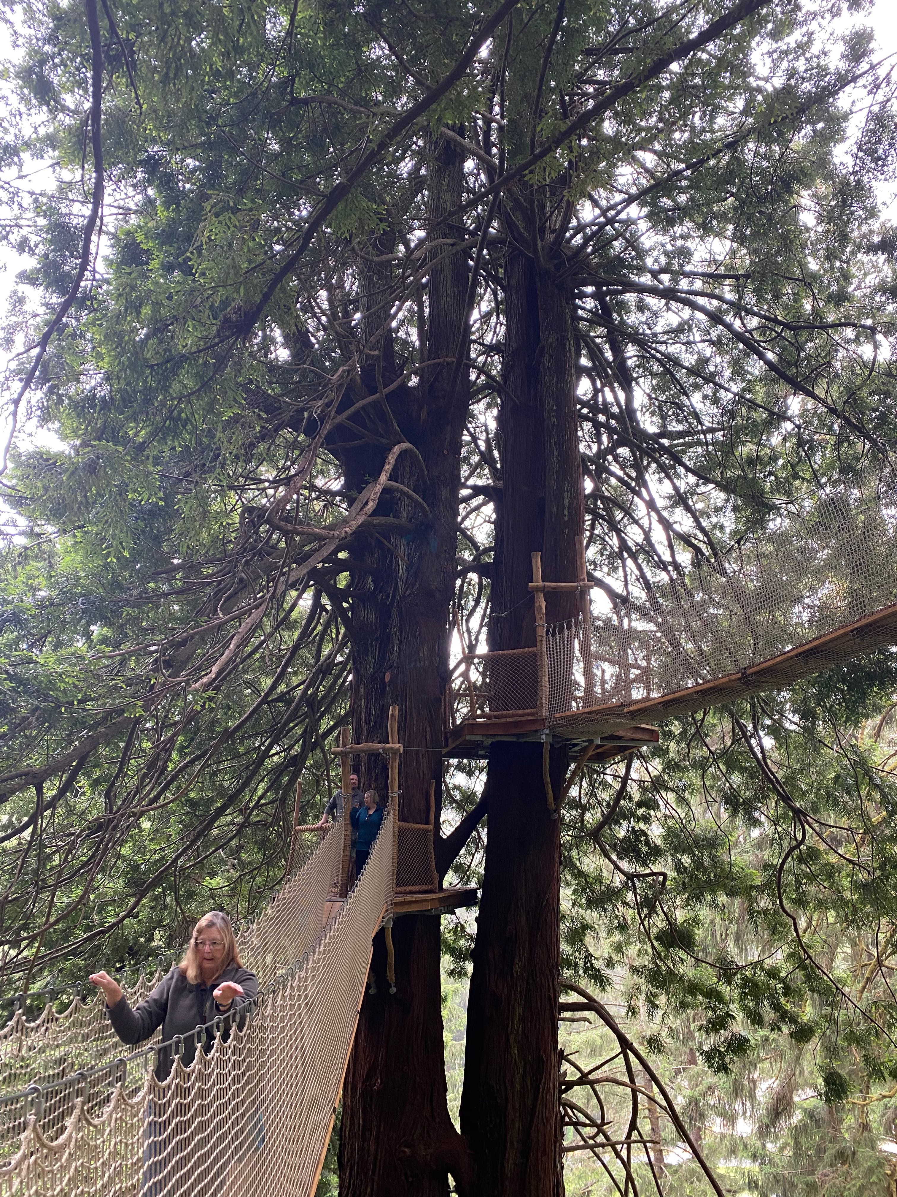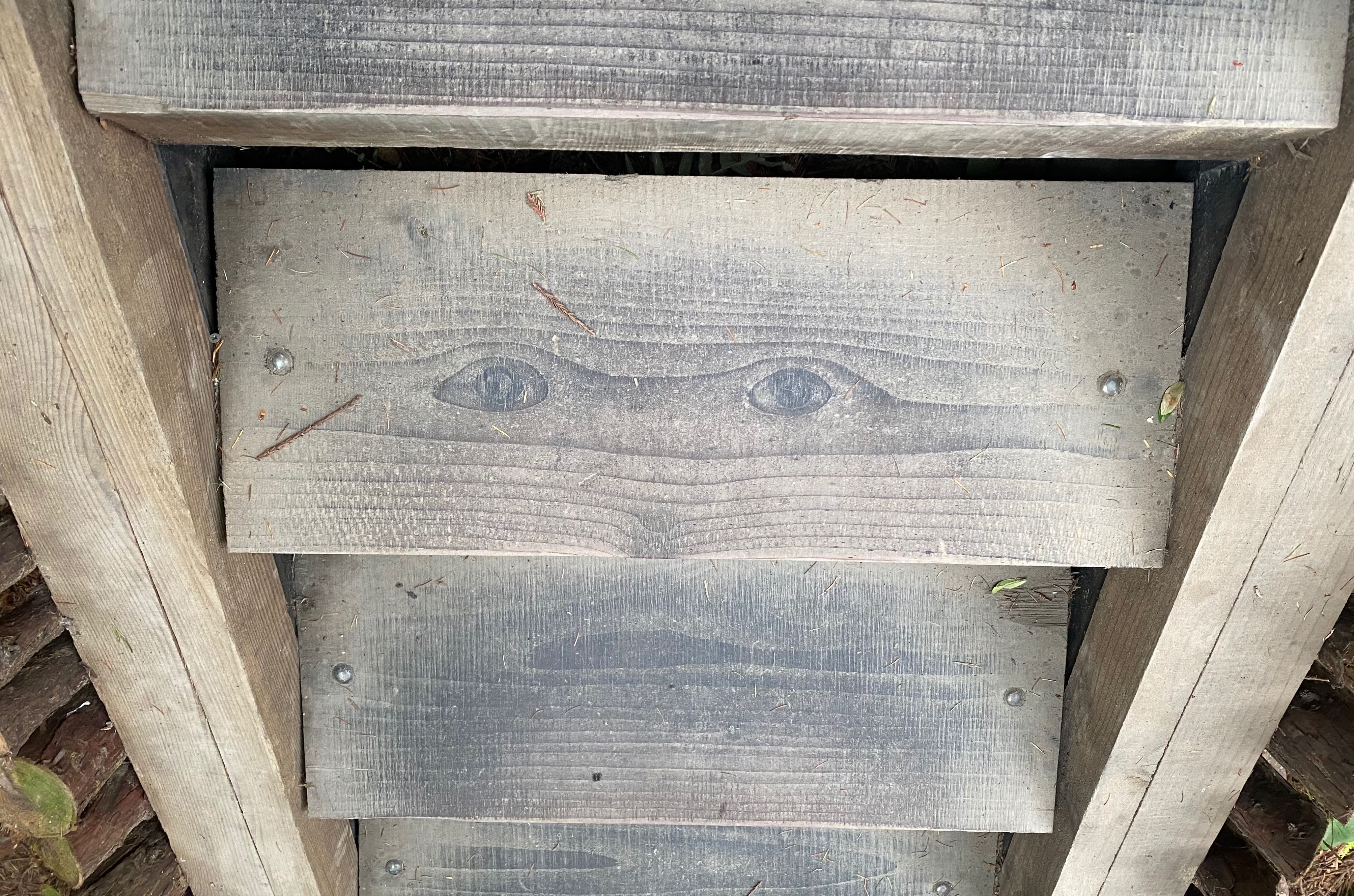 All of our earlier redwood hikes had been on the ground where the actual height of the trees is so difficult to capture. We were looking forward to getting a sense of height by walking the Redwood Canopy Trail –  an aerial series of suspension bridges through the redwoods at mid canopy level with viewing platforms from 50-100 feet high in the trees. There are 10 platforms, 2 of which are connected by a spiral staircase, and 8 suspension bridges. Bill found an interesting face on one of the stairs going up.