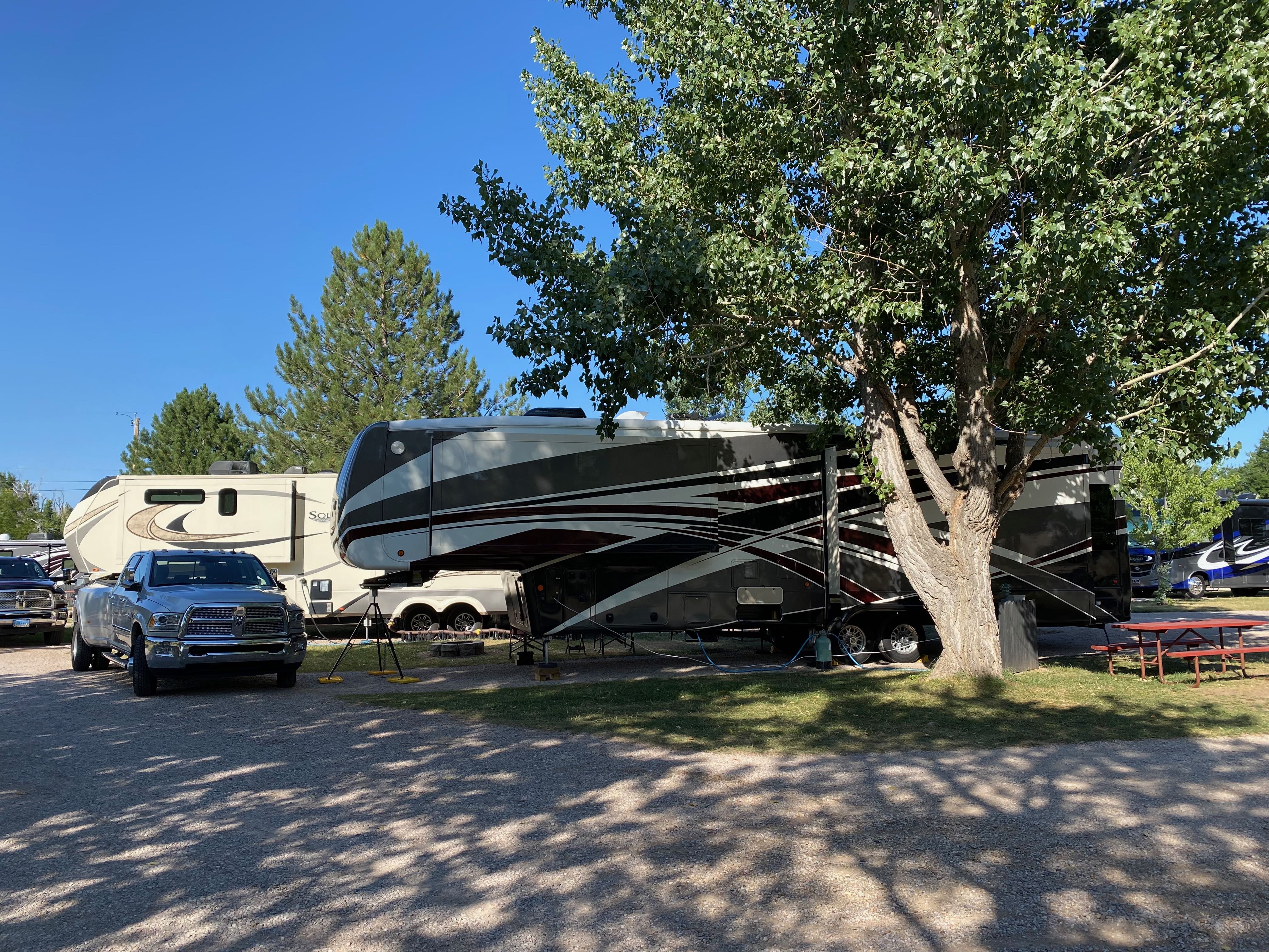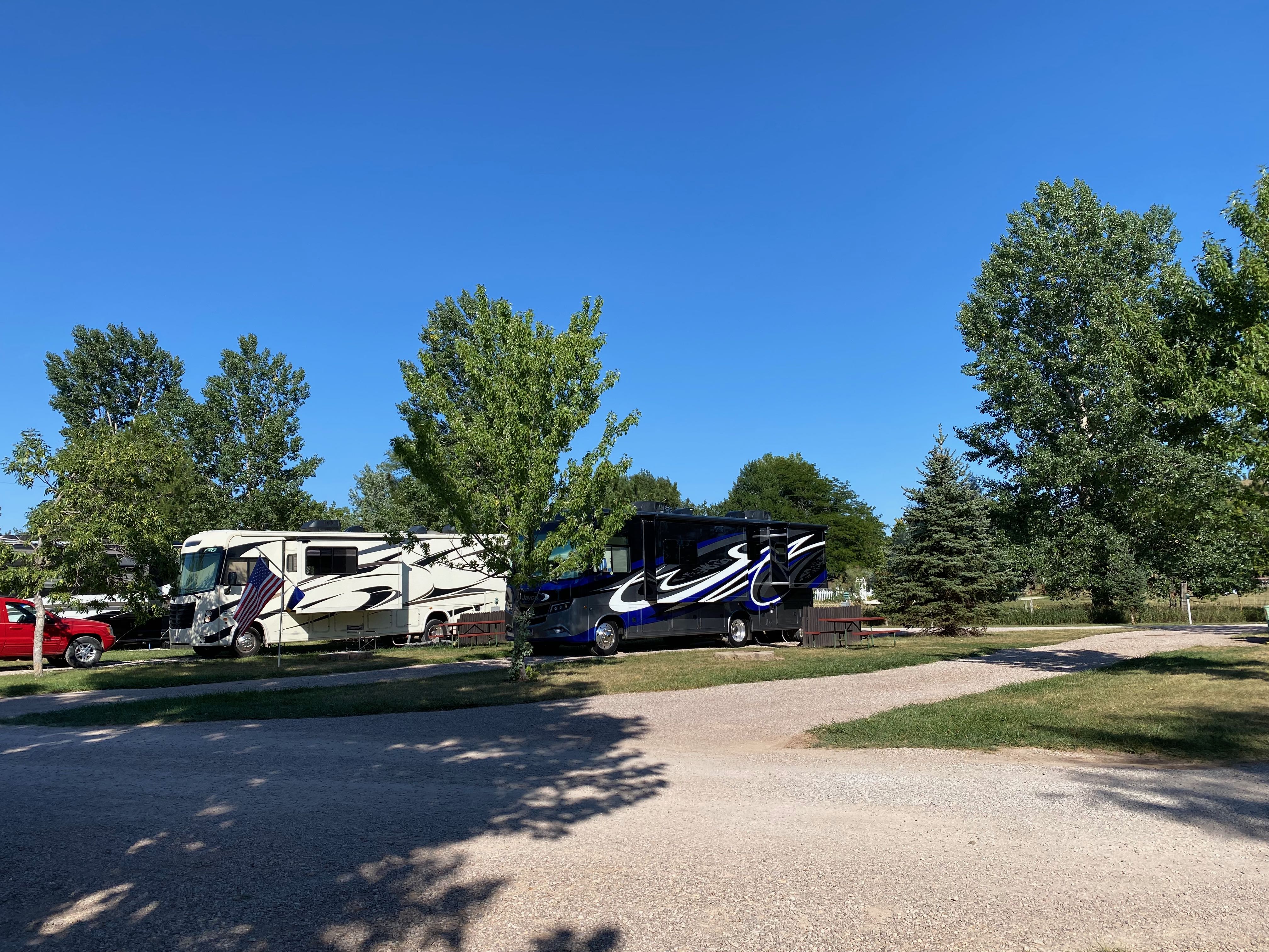 Our first choice campground in this area was already full when we were making reservations so we settled for the Spearfish/Black Hills KOA Holiday. Although KOA’s allow you to make reservations for a particular type of site (full hook-up pull-thru for example), they do not allow you to reserve a particular site. When we arrived, we were assigned a short site directly under a tree. We implored them to allow us to move to one of the empty long sites in the row directly behind our assigned site. They refused, telling us they would give a full refund if we chose to leave. (Where were we going to go over Labor Day weekend?) So, we stayed. We parked the truck as best we could, partially in the road, and we went without satellite TV. Fortunately they had decent cable and the internet speed was sufficient for streaming. (Priorities you know). We were entertained during our stay watching them stuff large rigs in short sites and short rigs in long sites.