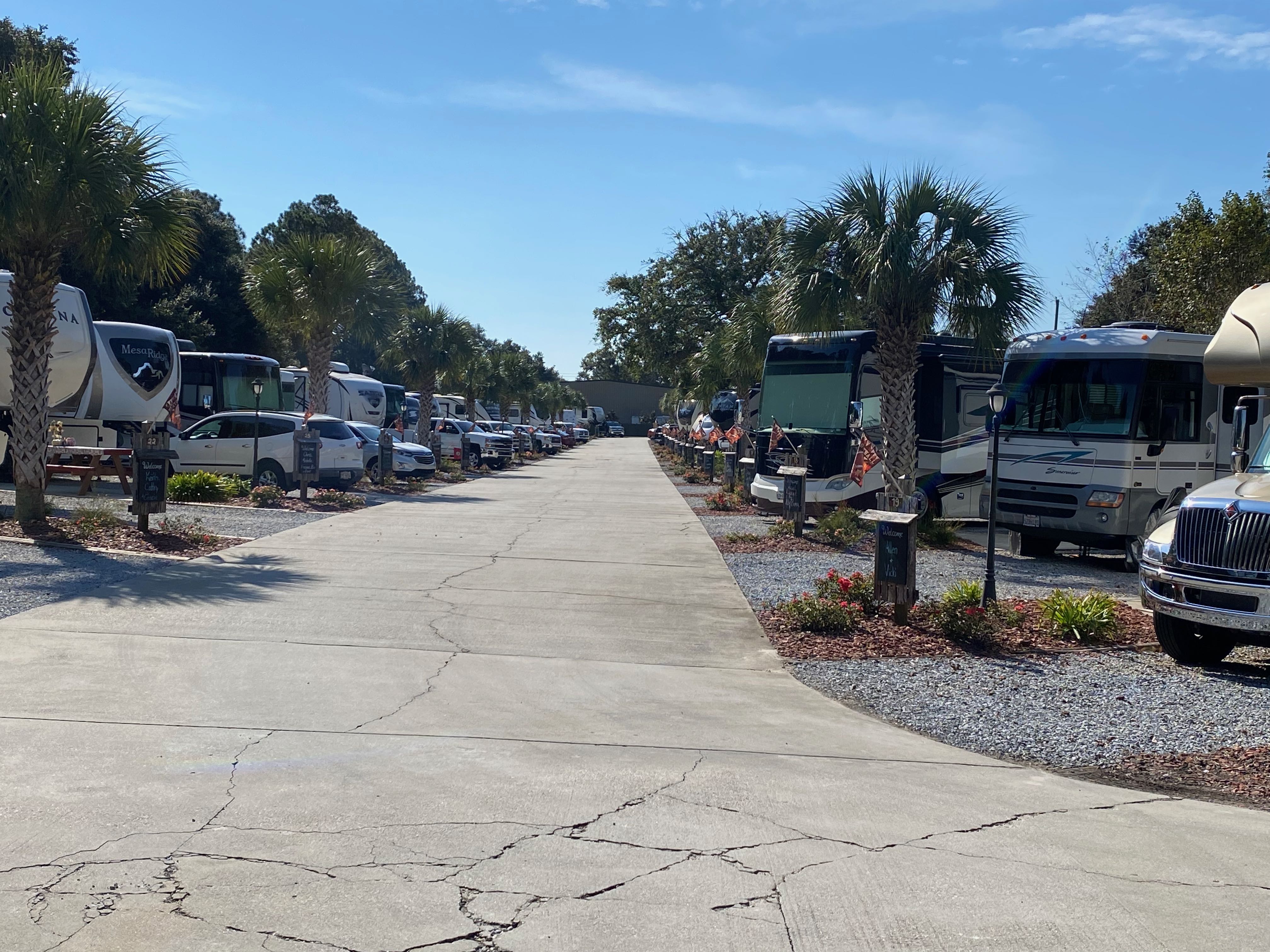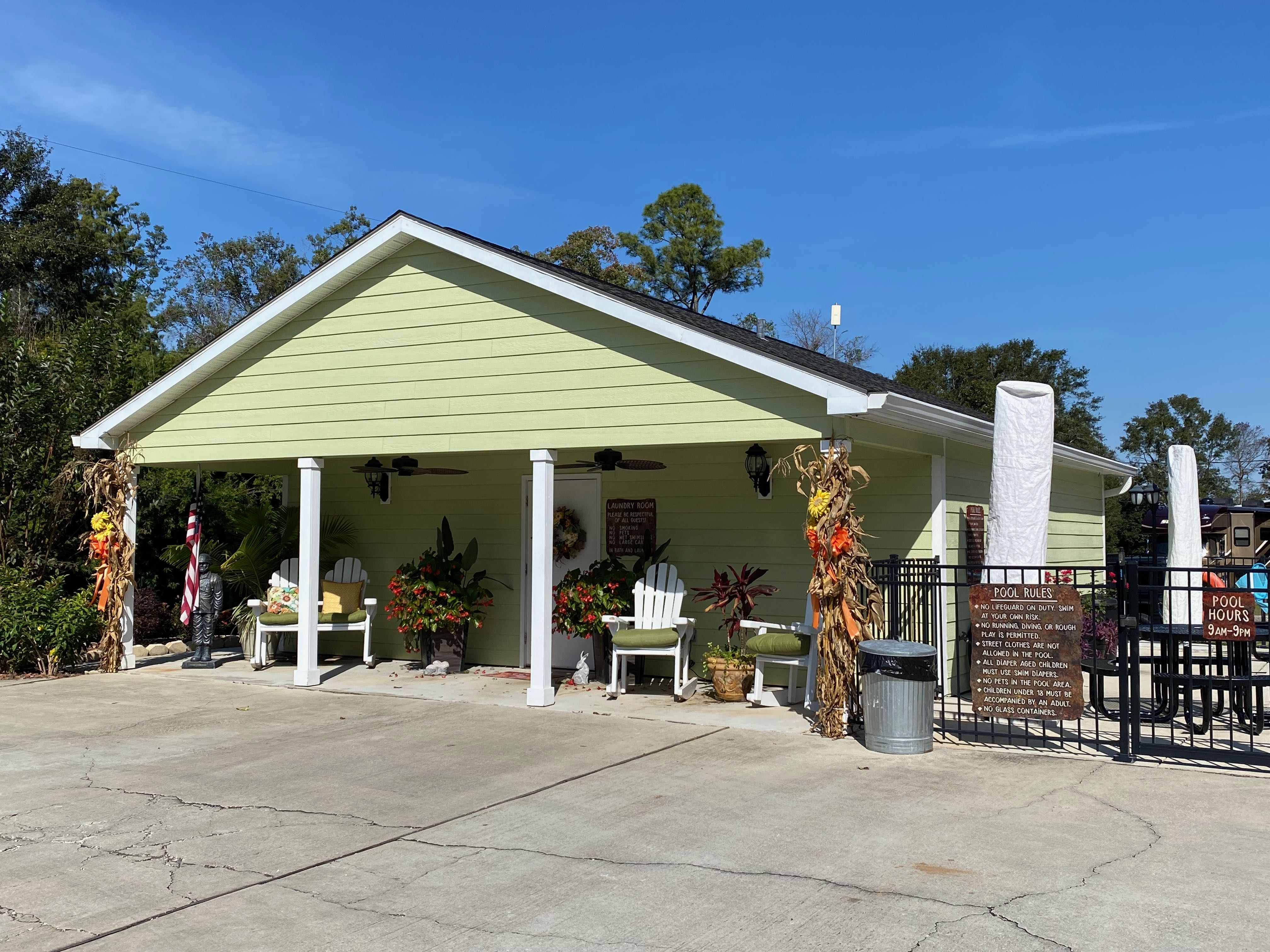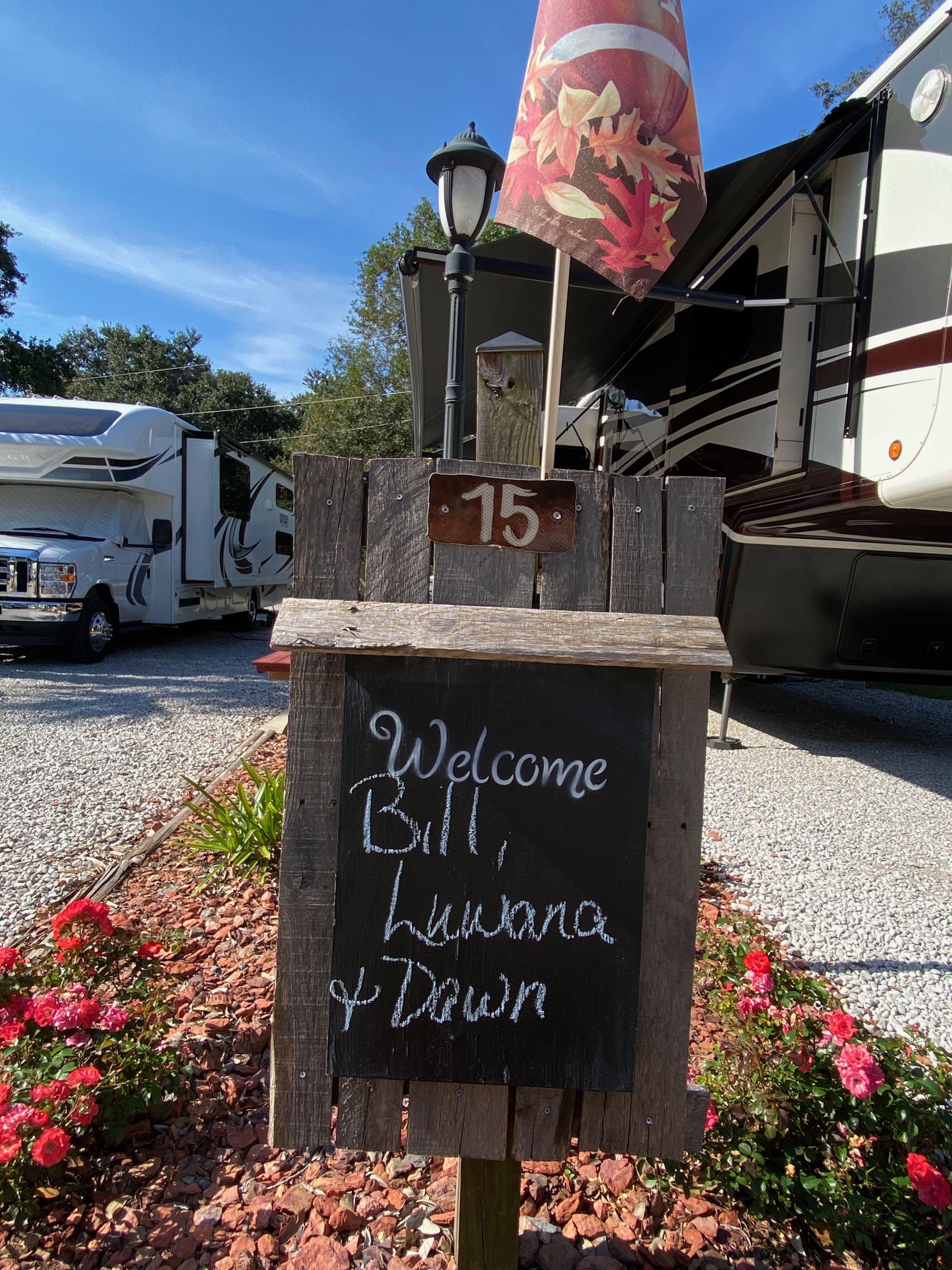 We called ahead as we exited the interstate and the RV park had someone waiting to get us through the gate and settled in our pull-thru site. The site was gravel with a small concrete pad with picnic table. The landscaping was well done and the chalkboard sign with our names was a nice touch. The pool, laundry room, pavilion and porch looked very inviting. Behind the back-in sites were swings, hammocks, and a lawn chess set. The only downside to the park was that the sites were close together and the streets in the park were narrow.