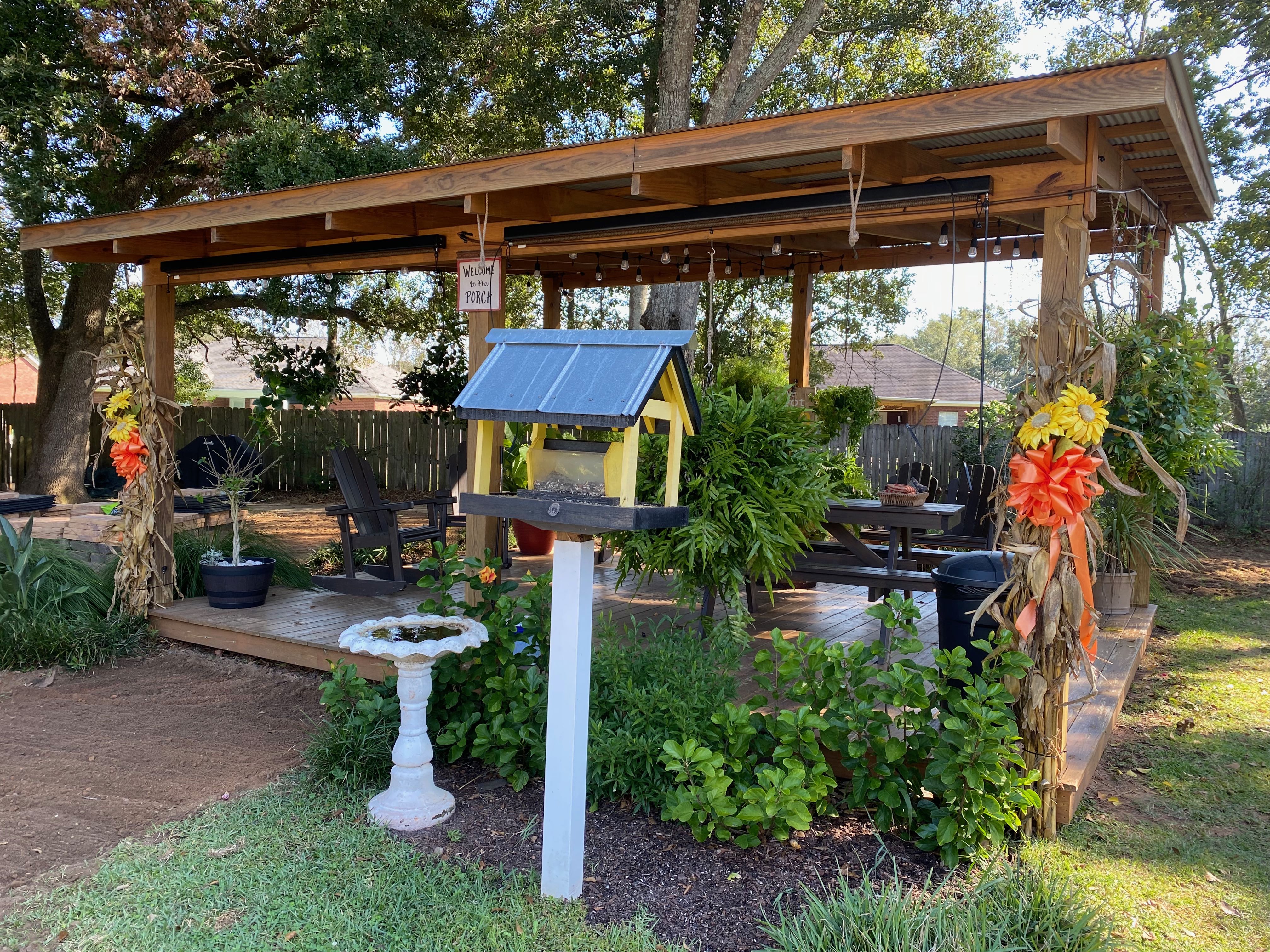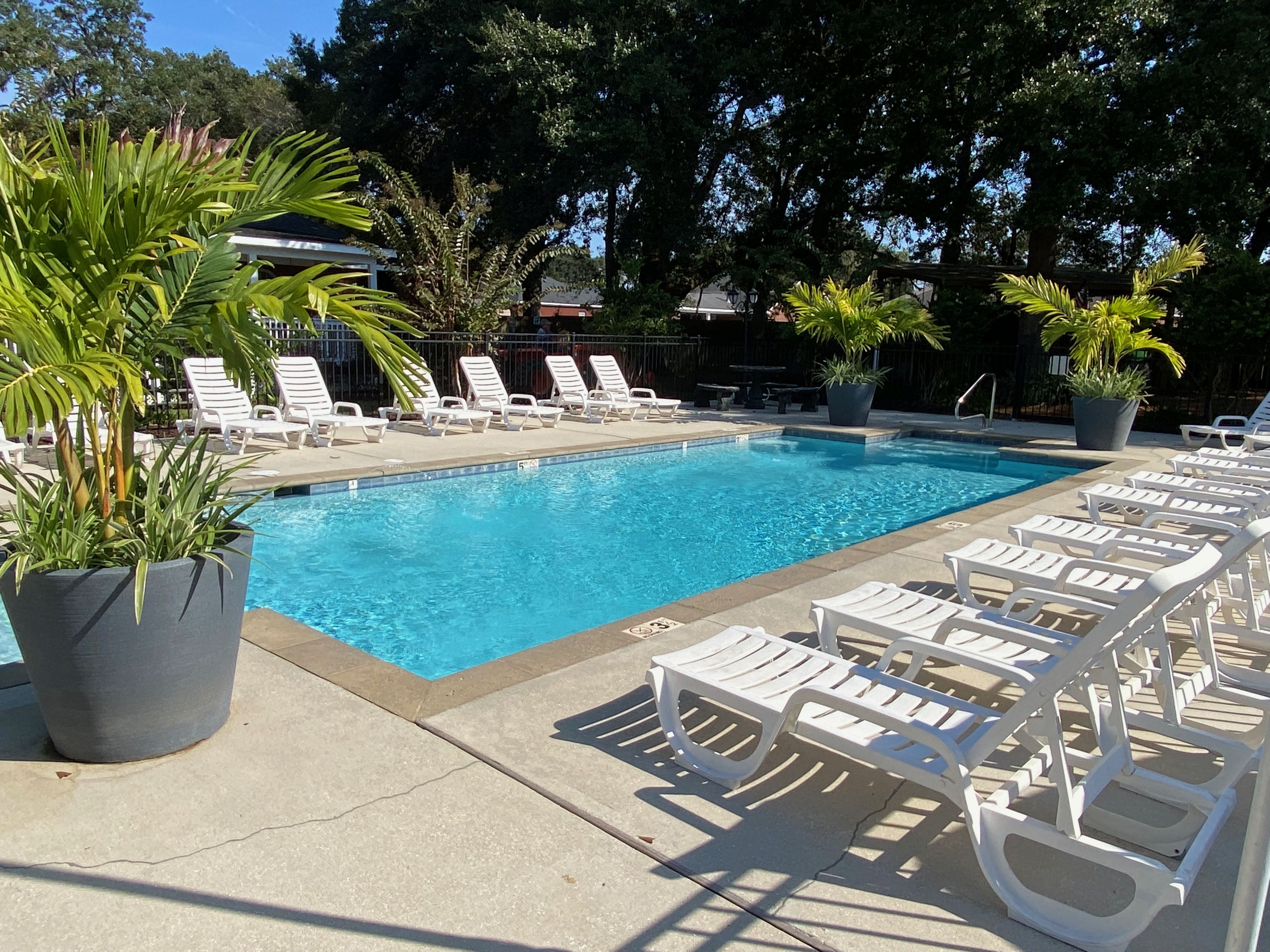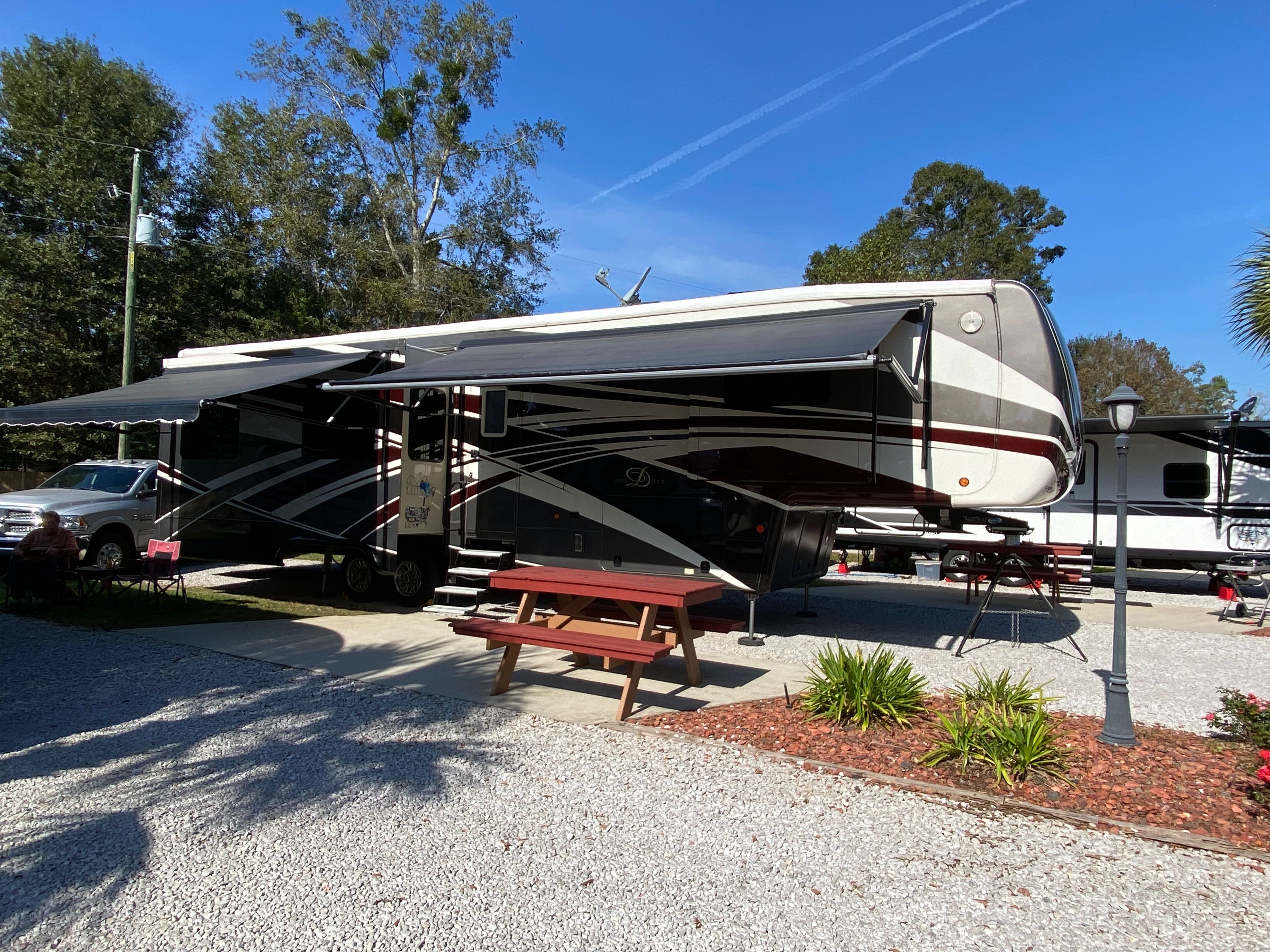 We called ahead as we exited the interstate and the RV park had someone waiting to get us through the gate and settled in our pull-thru site. The site was gravel with a small concrete pad with picnic table. The landscaping was well done and the chalkboard sign with our names was a nice touch. The pool, laundry room, pavilion and porch looked very inviting. Behind the back-in sites were swings, hammocks, and a lawn chess set. The only downside to the park was that the sites were close together and the streets in the park were narrow.