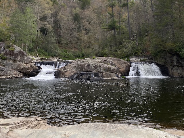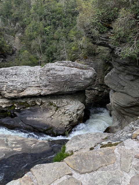 We turned off the Blue Ridge Parkway to drive through Linville Falls to the Linville Falls Visitor Center and trail to the falls. The hike to the falls was an easy .4 mile hike. While we were there debating about taking one or both of the optional hike extensions, it started to sprinkle. (We did have rain jackets but left them in the truck). As the rain intensified, we took shelter under a nearby tree. It didn’t take long until the deluge started and the tree could no longer shield us. Already soaked, we trudged the now muddy trail back to the truck where we dried off as best we could. As soon as we were inside the truck, the rain turned into hail. Once the storm subsided, we decided to bypass our planned stop in Black Mountain in favor of returning to the RV where dry clothes awaited. Needless to say, I ended up doing more laundry that afternoon.