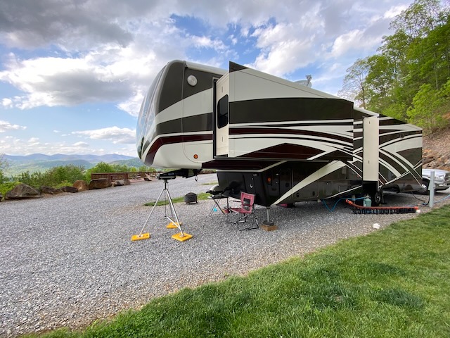 We like the top tier sites with the amazing views however, pulling a 41 foot fifth wheel up there is not for the faint of heart. In addition to the steep grade, you must also negotiate several sharp turns. The road is scarred by those who drug the rear of their unit going up or coming down. Fortunately with the help of a guide we made it up and into our pull-thru site without incident.
