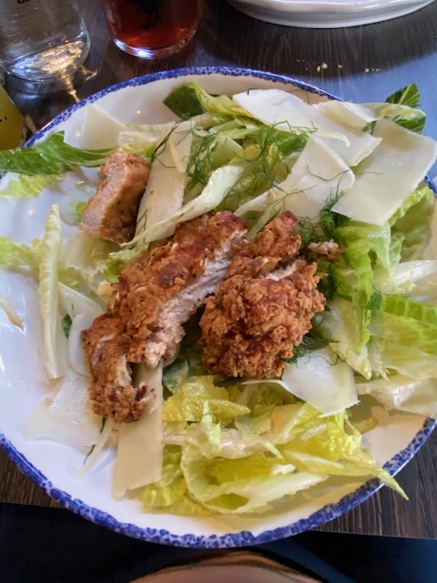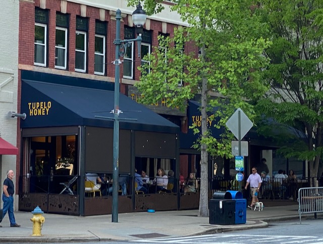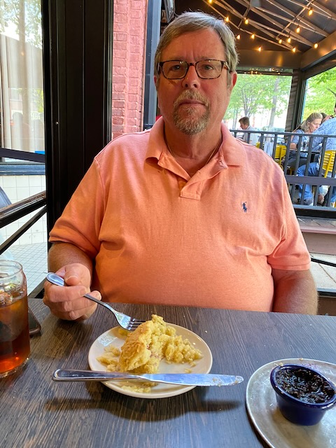 Later that evening we drove back into Asheville for dinner at Tupelo Honey a scratch-made southern food restaurant that was highly recommended by friends. Of course we had to try their cathead buttermilk biscuits served with blueberry jam and honey. Yum! We each had a cup of their Fire Roasted Poblano and Corn Soup followed by blackened mahi-mahi with crispy brussels for Bill and caesar salad with fried chicken for me. Awesome fried chicken!!