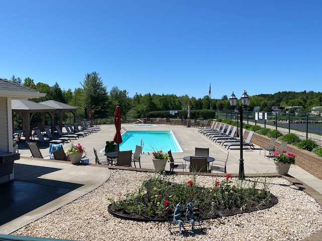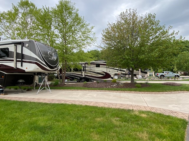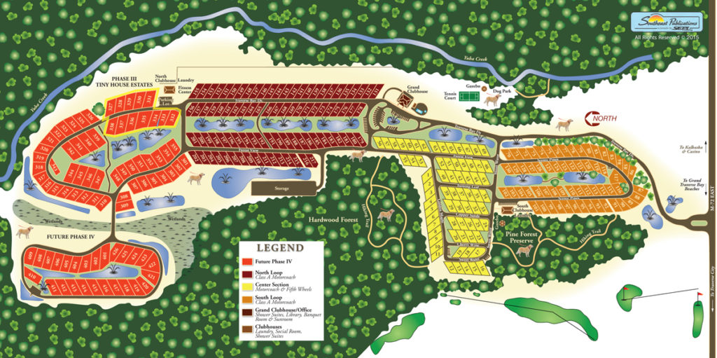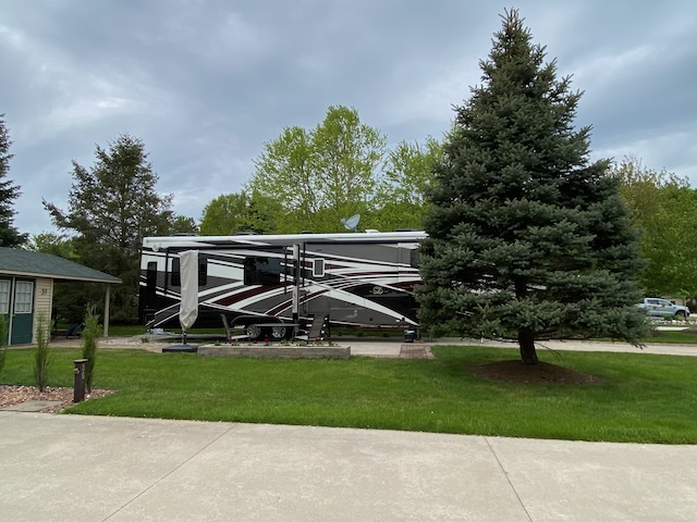 Where are we staying while we’re here? In Traverse Bay Resort on our very own lot. Yep, we own a piece of Michigan. We purchased a lot to use as a summer home and/or launching point for summer trips. We had visited the resort a couple of years ago and really liked it. The resort is divided into four sections – North and South Loops (Class A only), Center (where we are), and Tiny Homes Estates. Click on the map below to enlarge.
