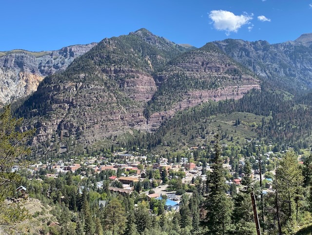 The High Bridge Trail takes you up 200 feet in a half-mile round trip hike. Along the trail are beautiful views of the town and the high peaks of the Amphitheater Cirque.