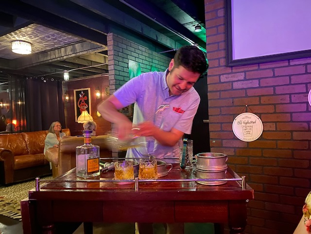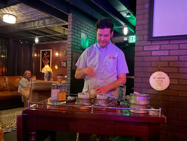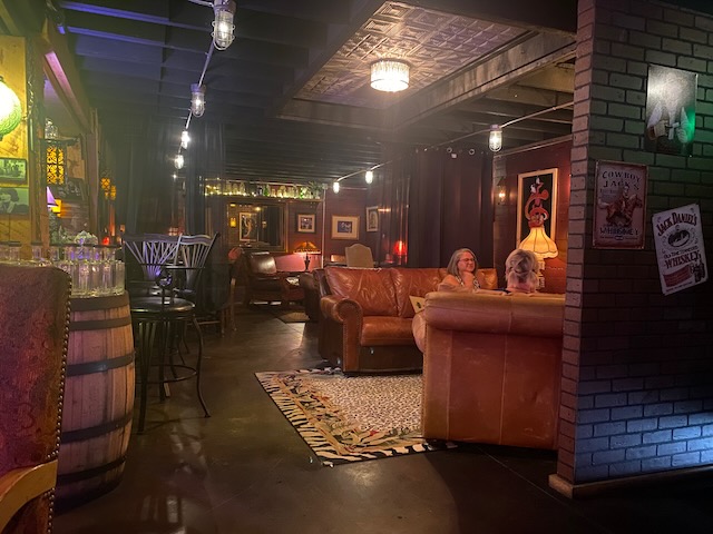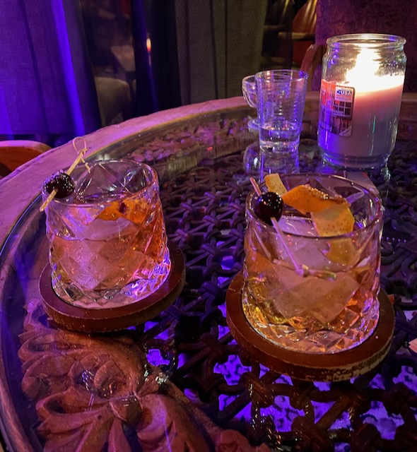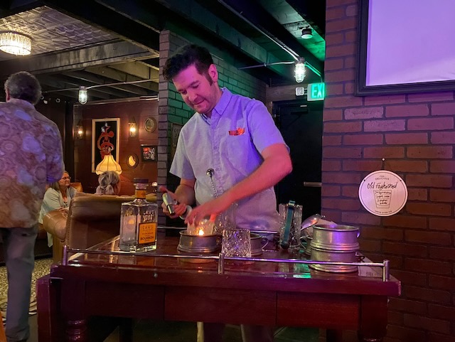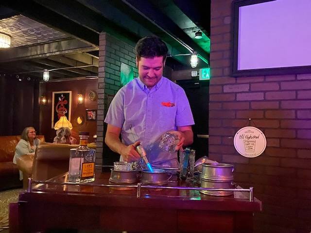 We were pleasantly surprised to discover that Montrose now has a speakeasy – Phelanies. Naturally, we just had to investigate. The building sits in an alley and the obvious entrance instructs you to proceed to an unmarked door around the corner. That door opens into a parlor setting with another door. Upon ringing the doorbell, someone requests the password through a secret grated opening in the interior door. Responding with the correct password gives you entrance to the speakeasy proper. The place is small and intimate with some comfortable sitting areas separated by sheer curtains as well as limited seating at the bar. Since this was dinner for us, we shared a charcuterie tray, flatbread pizza and a bottle of wine. As we were eating, we watched as a small cart was wheeled around the room and drinks were prepared using a small torch. Curious, we inquired about the drink and its preparation. It turned out to be their take on an Old Fashioned. They call it an Old Smokey. They use the torch to ignite a small piece of wood from a whiskey barrel (the same barrel that the Colorado whiskey was aged in) and then place a glass upside down over the smoking wood for a while. They then place a large ice cube in the glass prior to adding whiskey and other fixings. The last step is to garnish with a couple of Amarena cherries. Of course, we each had to try one.