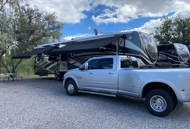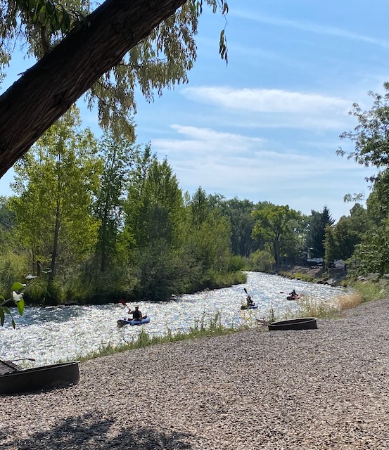 On past journeys to Montrose we stayed at the Montrose/Black Canyon KOA on the north side of town. This time we decided to try Riverbed RV Park on the south side of town. This park sits on the banks of the Methow River. Bill had selected a site that backed up to the river and we were looking forward to sitting out along the riverbank with our fire pit and perhaps some adult beverages. Unfortunately the weather was hot and flying/biting insects were plentiful. Oh well, we still had a nice view out the back window.