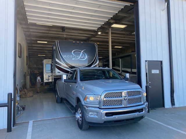 About 10 minutes outside of Elk City, Rolling Retreats called and said they could take us right then if we were close. 10 minutes later, Bill expertly backed the RV into their repair facility.