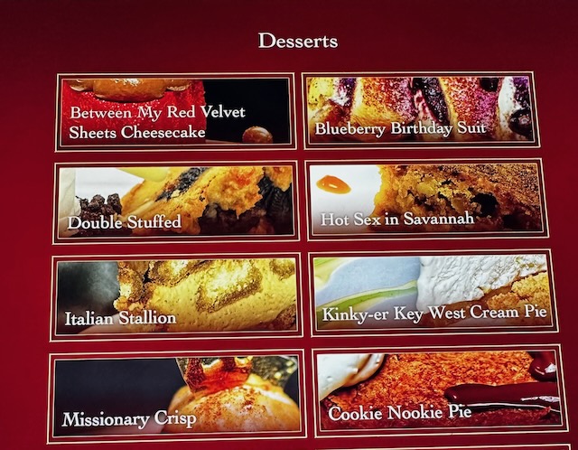 We finished off the evening at Better Than Sex for dessert. We had stumbled across this type of dessert restaurant in Key West and were delighted to discover one in Savannah. The lighting is intentionally dark with tables separated by curtains to create a more intimate setting. The menu is presented on an iPad and all offerings have suggestive names. Various libations are also available, some in chocolate-rimmed glasses. What a way to end the day!!