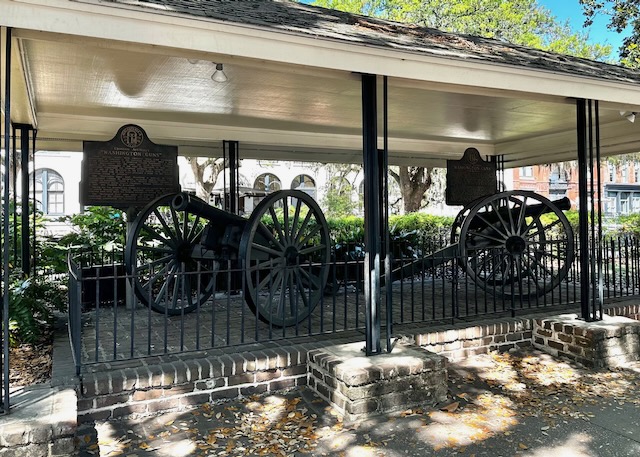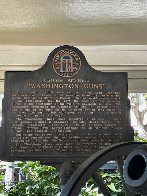 We eventually walked down to Bay Street to view the “Washington Guns” – George and Martha – two cannon that were captured from the British in the battle of Yorktown on the surrender of Lord Cornwallis, and gifted to the Chatham Artillery militia company by President George Washington in 1791.