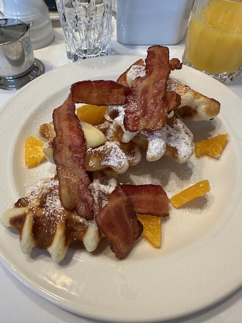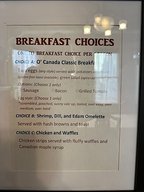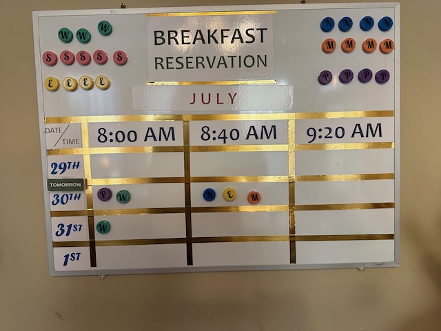 Breakfast was included with three seating times available and three choices (two selections changed each day). Each evening, guests selected their breakfast seating for the next day via a whiteboard in the dining room. At the same time, they also filled out an order page with their choice from the posted menu. The pantry with coffee, tea, baked goods, and snacks (as well as sherry for those that wanted a nightcap) was also available 24/7.