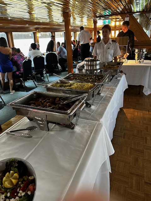 We took an Uber to the harbor where we boarded the MV Britannia. We were shown to our assigned table and given time to explore that ship prior to dinner. The food was served buffet style with hand-carved roast beef, salmon, chicken and plentiful sides and desserts. It was actually quite good. We were free to go out on deck at anytime to enjoy the skyline and sunset (around 9:30 that night).