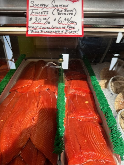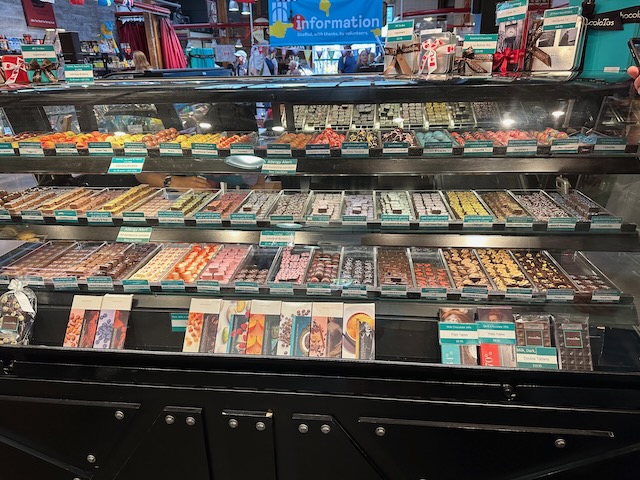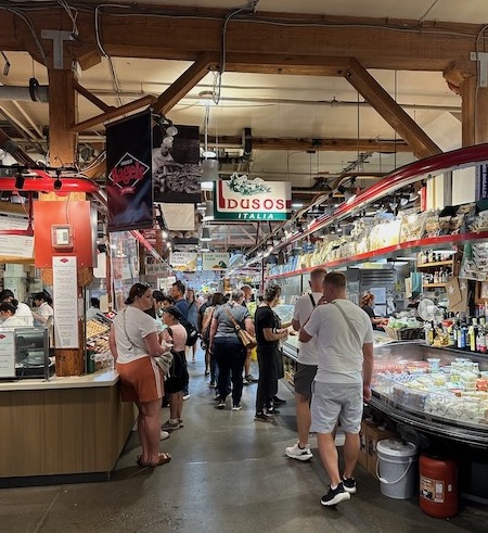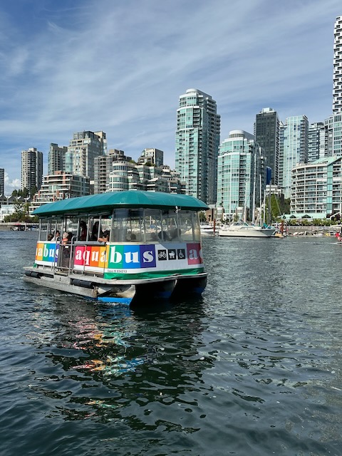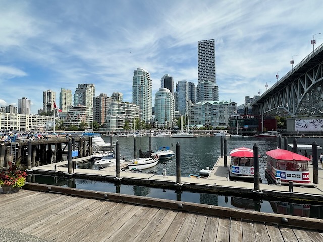 Following a good night’s sleep, we set off for our first full day of exploring Vancouver. Our target today was Granville Island – a peninsula and shopping district across False Creek from Downtown Vancouver, under the south end of the Granville Street Bridge. To get there, we walked to the Hornby Ferry Terminal and took an Aquabus across False Creek. The walk was about 15 minutes and the ferry ride about 5 minutes. The major attraction for us was the Granville Island Public Market – a European style market with vendors selling everything from meat, cheese, fish, bread, fresh produce, chocolate, fudge, to clothing and souvenirs. There are also numerous restaurants to choose from.