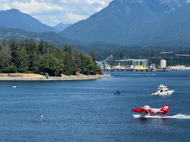On the morning of our flight, we got up at 2 a.m. to complete the last minute packing, shower, dress, and drive to the airport. We left the truck in the long-term parking lot and checked in for our 6 a.m. flight. We changed planes in Chicago and landed in Vancouver around 12:30 p.m. Our arrival was delayed by about 1.5 hours due to a storm in Chicago. We watched the skies darken while waiting to board that connection. Once we were all aboard, they delayed push back for a bit. Once free of the gate, we joined a line of planes on the taxi-way awaiting take-off assignments. Meanwhile we could see the storm getting closer. After waiting there for some time, the pilot made an announcement that we had a take-off assignment number. By now, it was raining a lot. Next, the pilot informed us that we had been asked to move out of line. So, we sat on the tarmac until the storm passed. What fun! Finally, the weather began to clear and we eventually were on our way to Vancouver.