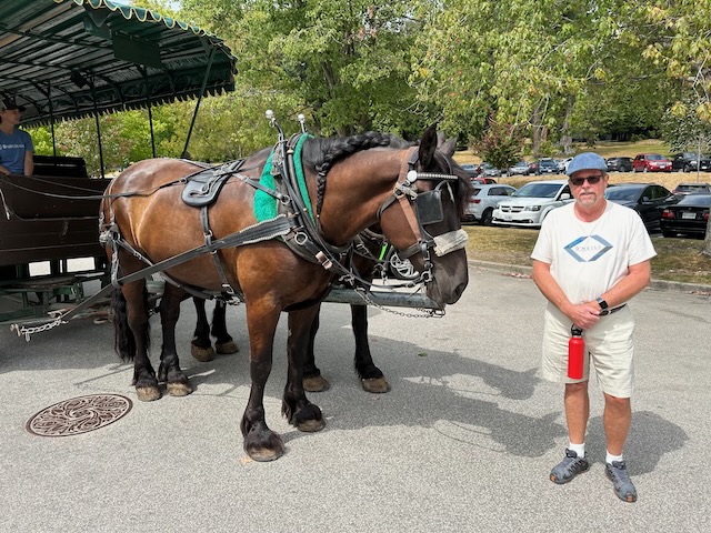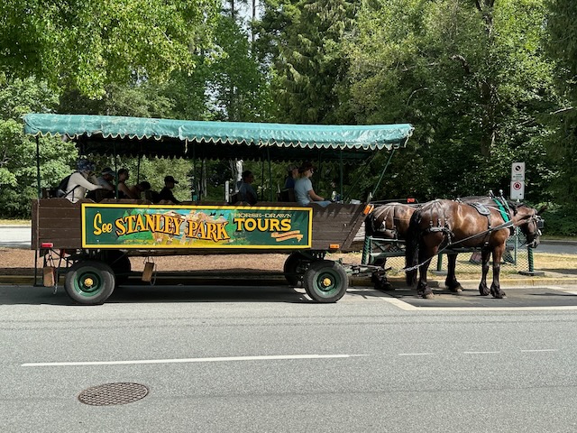 For an overview of the park, we elected to take a one hour horse-drawn tour. The tour included a stop at the Totem Poles and provided views of the Rose Garden (unfortunately beyond its prime), the Lions Gate Bridge, the red cedar forest, Deadman’s Island, the Girl in a Wetsuit Statue (Vancouver’s answer to the Little Mermaid Statue in Copenhagen) and the Empress of Japan Figurehead. It was a fun tour but not quite what we expected. Would you believe that one of the horses was named Bill?