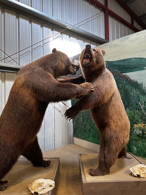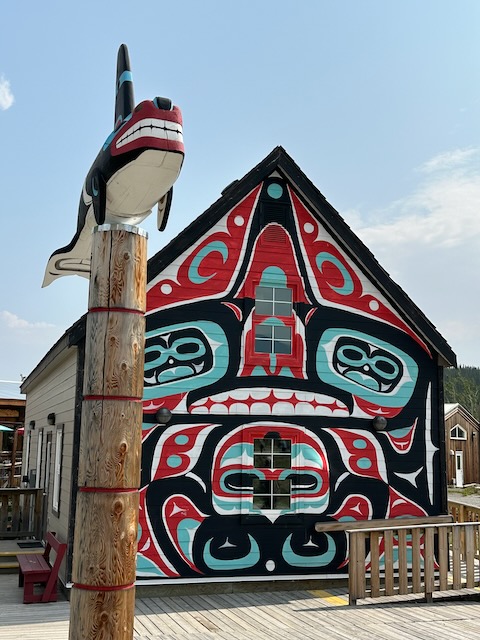 The tour route paralleled the 1898 Gold Rush Trail to the White Pass summit at 3292 feet with views of waterfalls, a coastal rainforest, and stops at the Welcome to Alaska sign, Summit Lake, and Tormented Valley. We had to show our passports as we entered into the Canadian Yukon Territory where the weather changed from misty to sunny due to the mountains. We also stopped at the Yukon sign, Emerald Lake, and Carcross Desert (that’s right, a sand desert). Our lunch stop was at Caribou Crossing where we had BBQ chicken, roasted potatoes, coleslaw, rolls, and fresh donuts. In addition to a gift shop, the facility also housed a wildlife gallery of over 100 Arctic and Yukon taxidermy animals. There was also a Sled Dog camp where we could view the dogs and puppies.