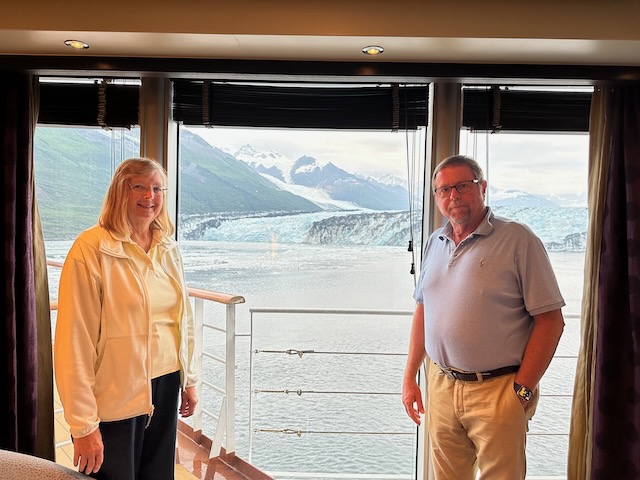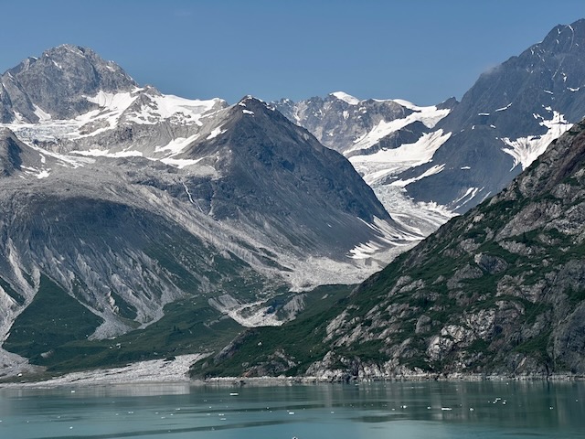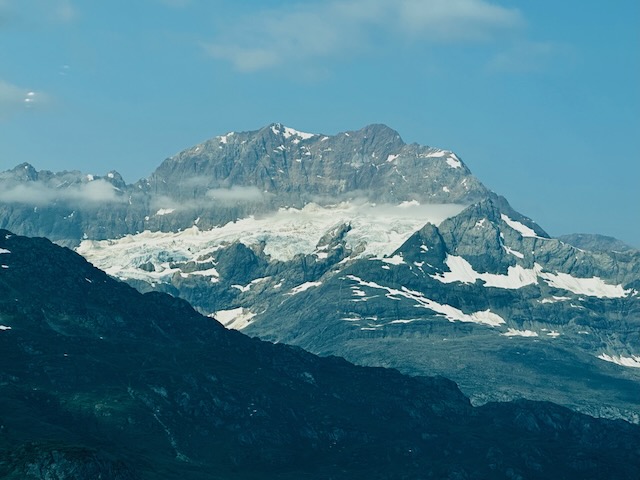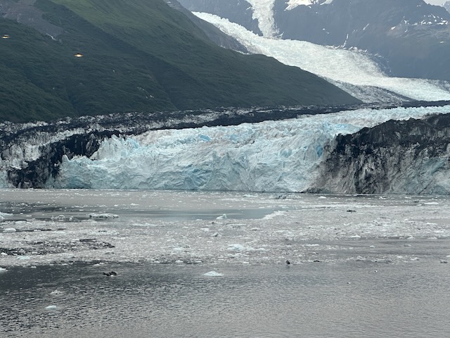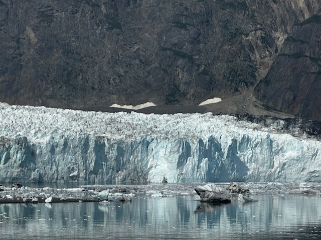 Only two cruise ships per day are permitted in the Bay. Our ship started the journey at 6 a.m. Along the way some park rangers came aboard (delivered by boat and facilitated by rope ladder). They offered commentary, answered questions, and provided park literature and merchandise. The bow of the ship was opened to allow guests great (albeit chilly) views of the mountains and glaciers. Of course, the best indoor spots were crowded. Bill and I found spots along the railing of some of the more protected outside decks. As we approached Margerie Glacier, the captain stopped the ship and then slowly spun it for about an hour so all could get a good view.