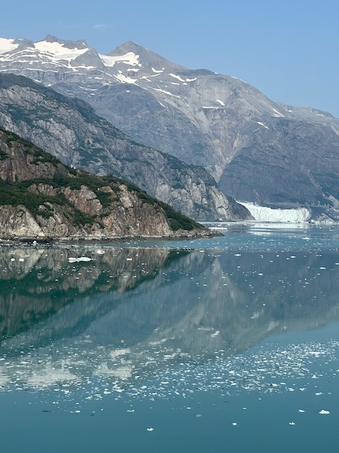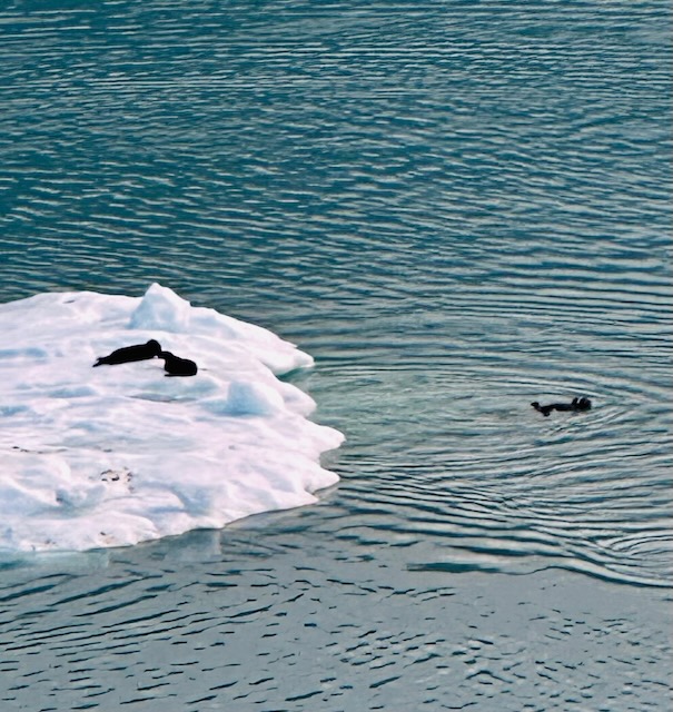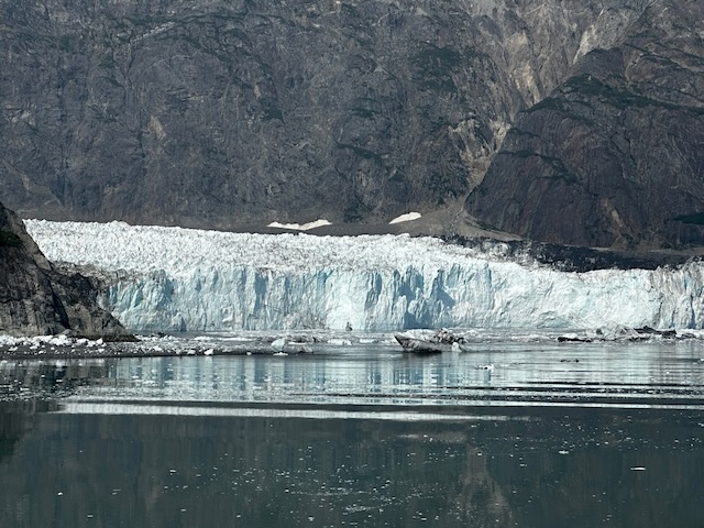 Shortly after our arrival, the glacier calved. Unfortunately neither Bill or I had our phones ready. We couldn’t believe the sound of the cracking and the resulting thunder as the ice fell into the water. It’s hard to believe that this glacier is over 200 feet tall – much taller than our ship! We also saw the Reid Glacier and the John Hopkins Glacier during our 6 hour cruise through Glacier Bay.