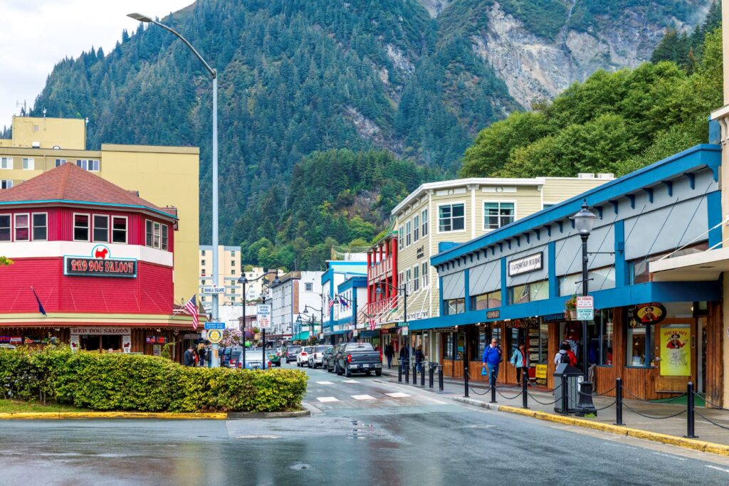 Like much of the United States, Ketchikan boomed in the 1920s rapidly growing into one of the largest cities in Alaska. The rapidly expanding economy brought miners, loggers, and fishermen who spent the earnings of their labor on Creek Street. This was Ketchikan’s infamous red light district that lined the banks of the creek with bordellos, gambling, and dance halls. Illegal liquor, brought in by enterprising rum runners through trap doors at high tide, flowed freely in the creekside establishments. Acting as monuments to Ketchikan’s colorful history, these historic buildings on pilings are now colorful shops and homes standing brightly painted against the emerald, forested hillside. From Thomas Basin, the harbor at the mouth of the creek, the town spreads narrowly along the shoreline, with fish processing, float plane operators, cruise ship docks, and other commercial interests dominating the waterfront while residential homes cling to the steep mountainside above them.