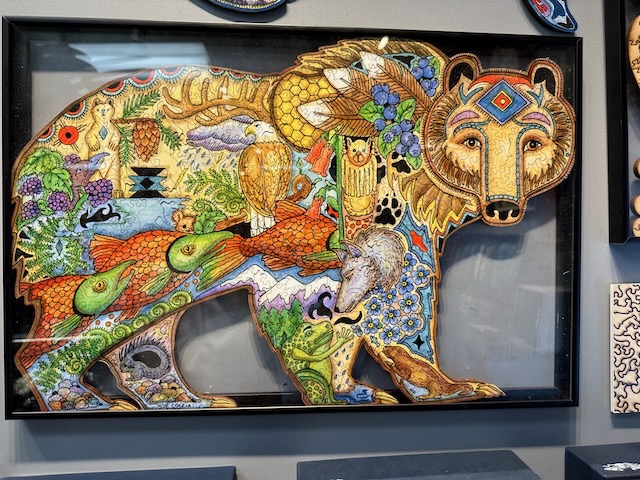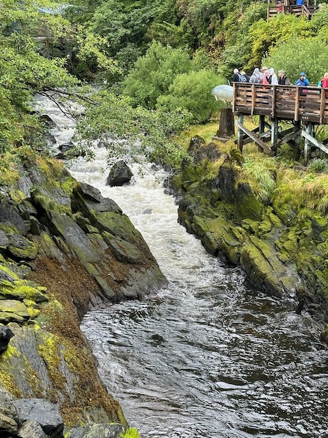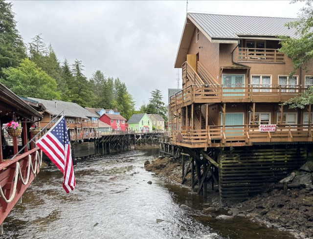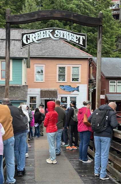We were given a ride back to town where we investigated a few of the shops along Main Street before making our way to historic Creek Street. Looking down from the bridge crossing the creek, we could see lots of salmon just hanging out. To our left was a salmon ladder but due to the lack of rain (which helps the salmon via smell determine the exact stream in which to spawn), they were not jumping. We continued our trek, checking out the various shops along the way.
