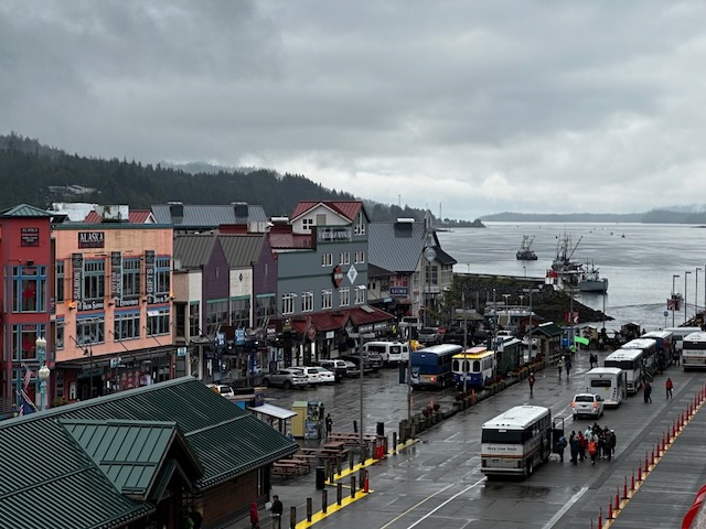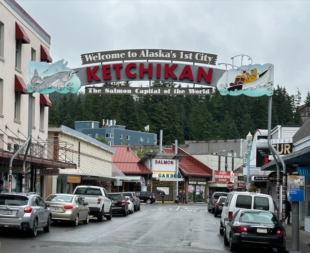 Our first port of call was Ketchikan where we docked at 7 a.m. How fun is it to pull back the curtains and discover that a town had appeared outside our veranda while we slept? After the wonderful weather that we had enjoyed in Vancouver, it was somewhat of a letdown to see wet streets and gray skies. However, the residents were happy as they really needed the rain. We really only encountered a mild morning drizzle.