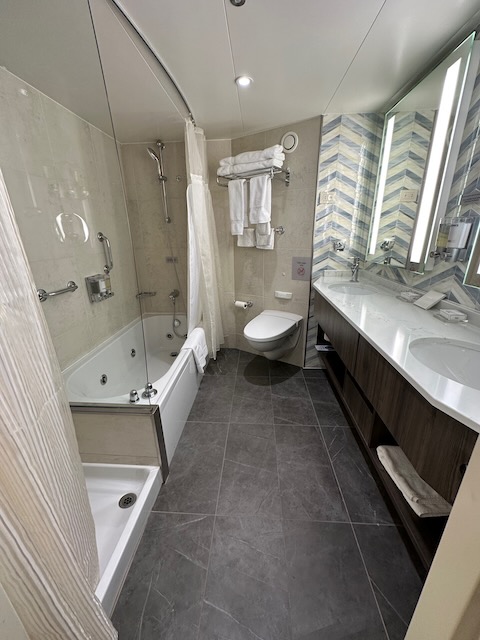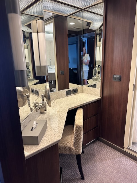 Soon, two of our three suitcases arrived. Bill’s bag was still on the dock (according to the AirTag). As the afternoon progressed and his bag still had not been delivered, he contacted the concierge in the Neptune Lounge and asked him to look into it. As it turned out, for whatever reason, that one bag was in the very last group of bags to be loaded. But it finally made it to our suite. Whew!