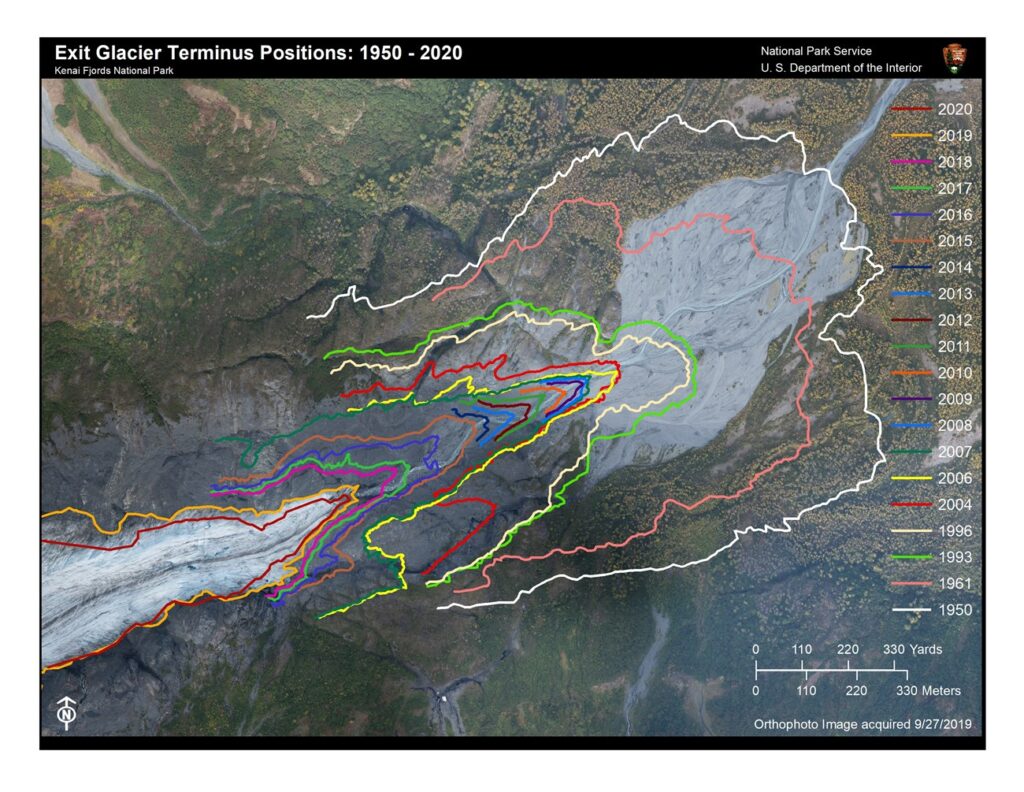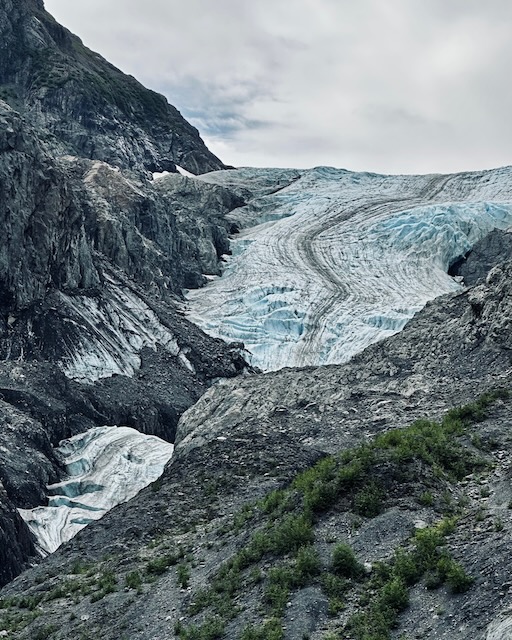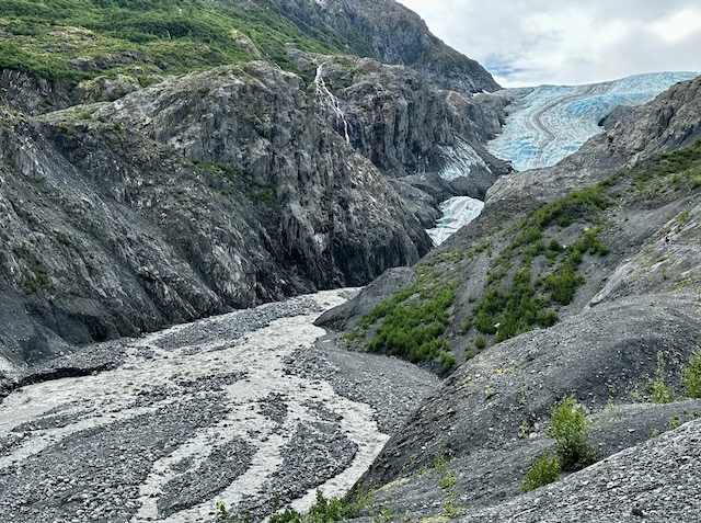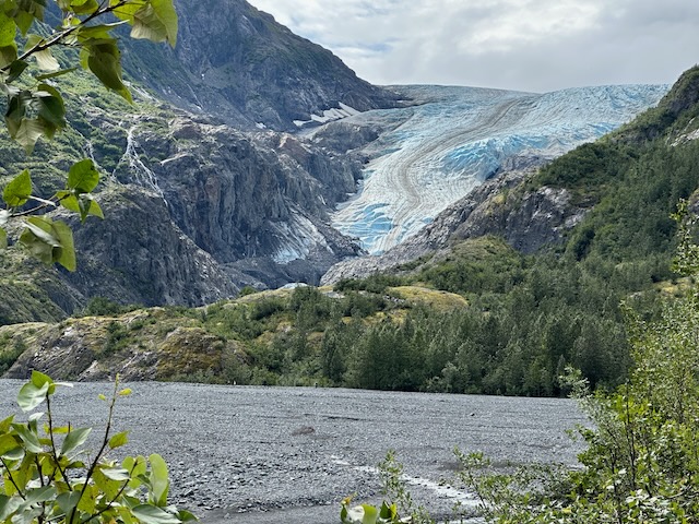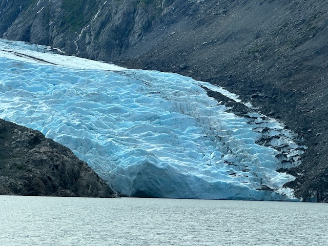 Following our dog sled ride, we boarded the bus for a trip into Seward where our driver gave us a brief tour and then dropped us at one of the restaurants for lunch. After lunch, we were taken to the Exit Glacier area in the Kenai Fjords National Park where we had time to visit the Nature Center and hike one of the many trails back to the glacier. There are signs along the trails showing how the glacier has receded in the last 50+ years.