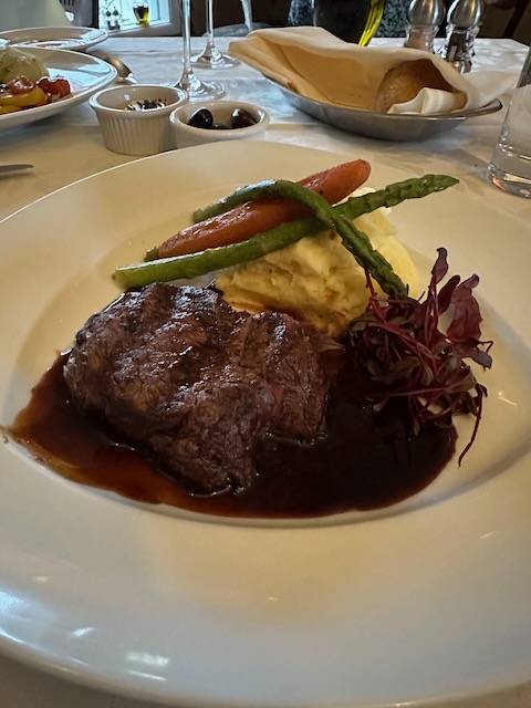 Owner Richard “Van” Hale greeted us as we walked in and showed us to our table. He took our order and then wheeled his salad cart over where he proceeded to prepare his special Caesar Salad. I balked when he started to add anchovies but he assured me that he knew what he was doing. Needless to say, he was right and the salad was fantastic. He also asked a server to provide each of us with a glass of Gewürztraminer and instructed us to take a bite of salad and then a sip of wine. The wine really accentuated the ingredients in the salad. For dinner, I had filet mignon (perfection) while Bill had the macadamia encrusted halibut (which he said was good). And for dessert – creme brûlée with two glasses of 40 year port. Are we really only here for one night??