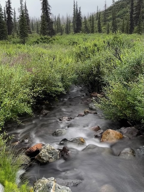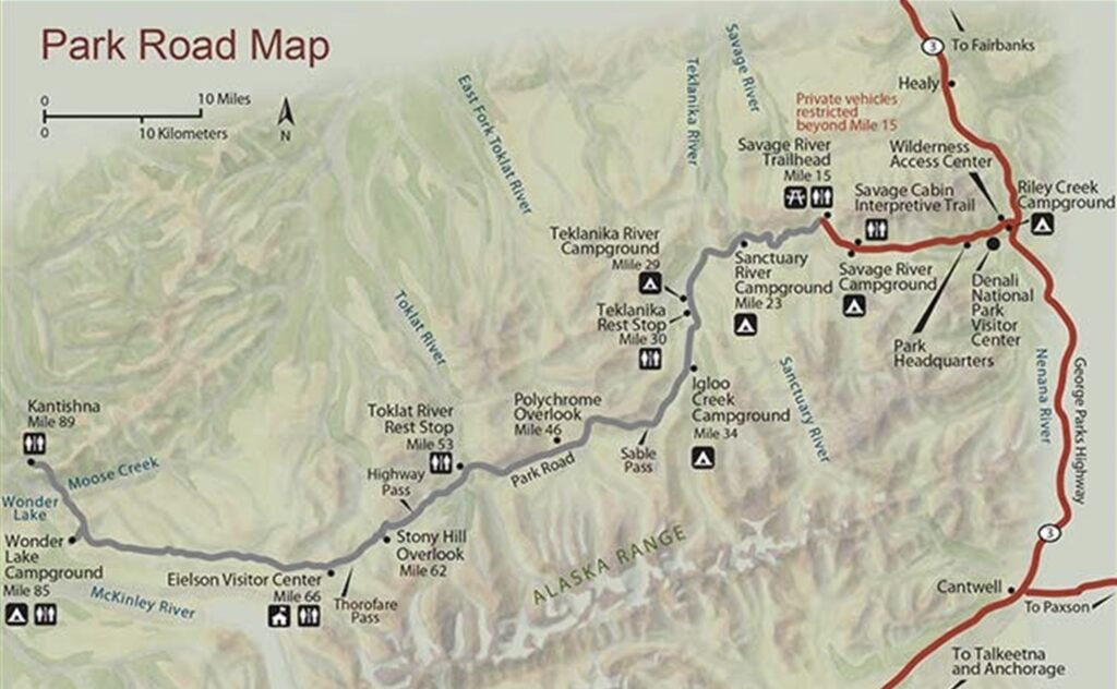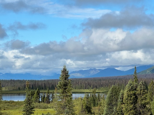 We were originally scheduled on the 5 a.m. departure and had decided to do the photo tour instead. It turned out that we were reassigned a 3:30 p.m. departure as the exact times are not assigned by the park service until 48 hours before departure day. I talked Bill into going on this tour – my bad. (He hasn’t forgiven me yet.) We already knew that the tour only travels 42 miles of the 93 mile road due to a landslide at Pretty Rocks in 2022 then turns around. We also knew that the tour bus was a modified (with upgraded seats and flat panel displays) school bus. What we didn’t know was that a good portion of the route is on a gravel road and that we would end up in the very back seats of the bus. Talk about long and uncomfortable!!! The bus does stop at a rest area each way and snack boxes and water are provided. It also stops when wildlife is spotted but no one is permitted to get off. The driver has a spotting scope that he can use to project the wildlife on the flat panel screen. Most of what we saw were tiny specks in the distance and still no Denali!