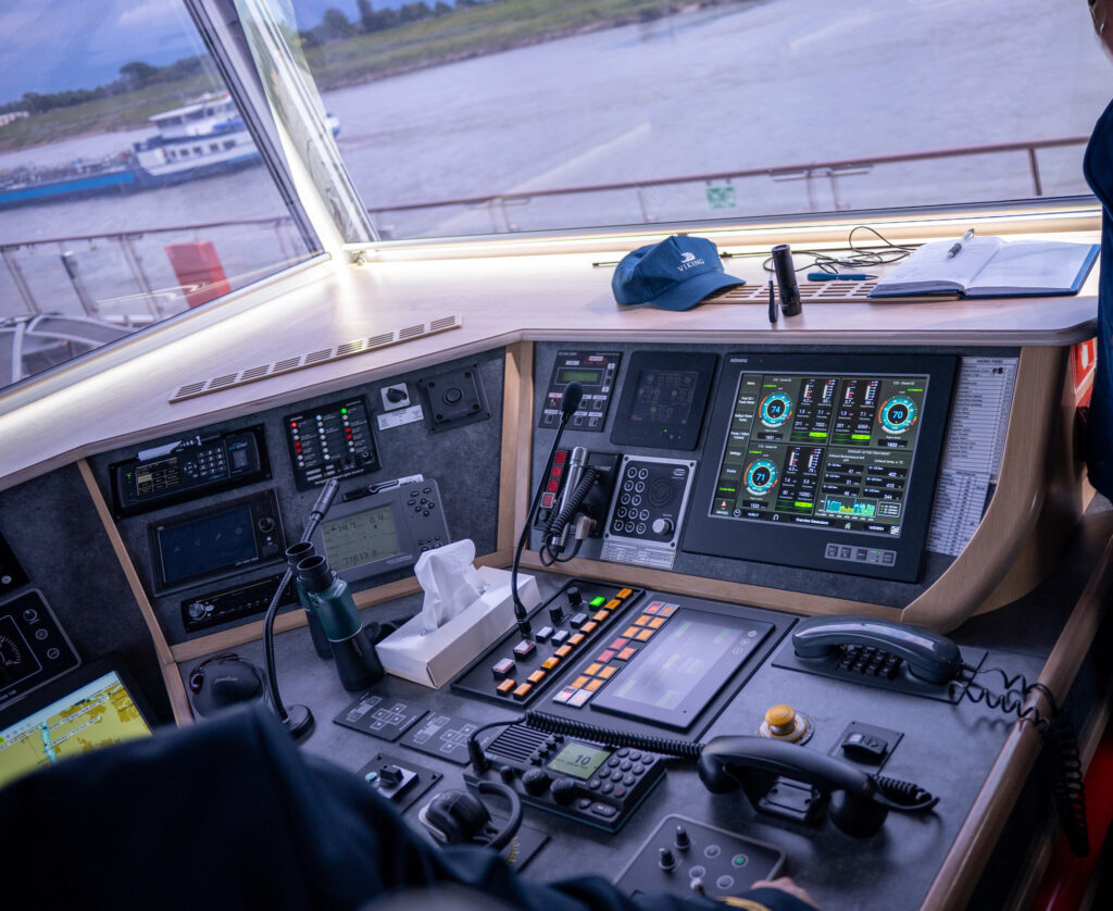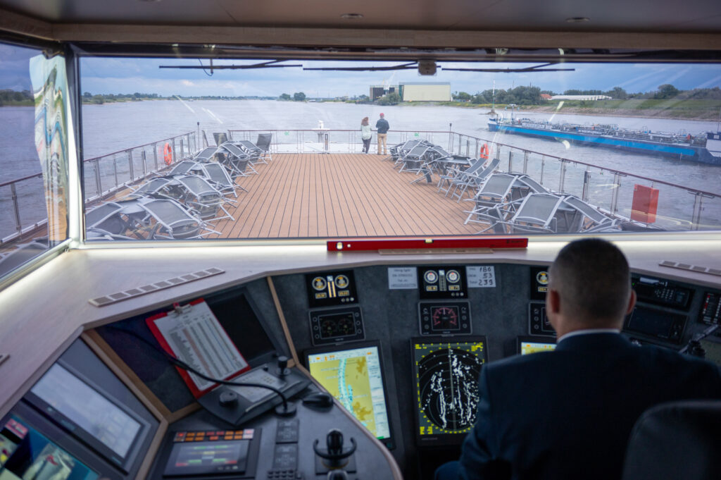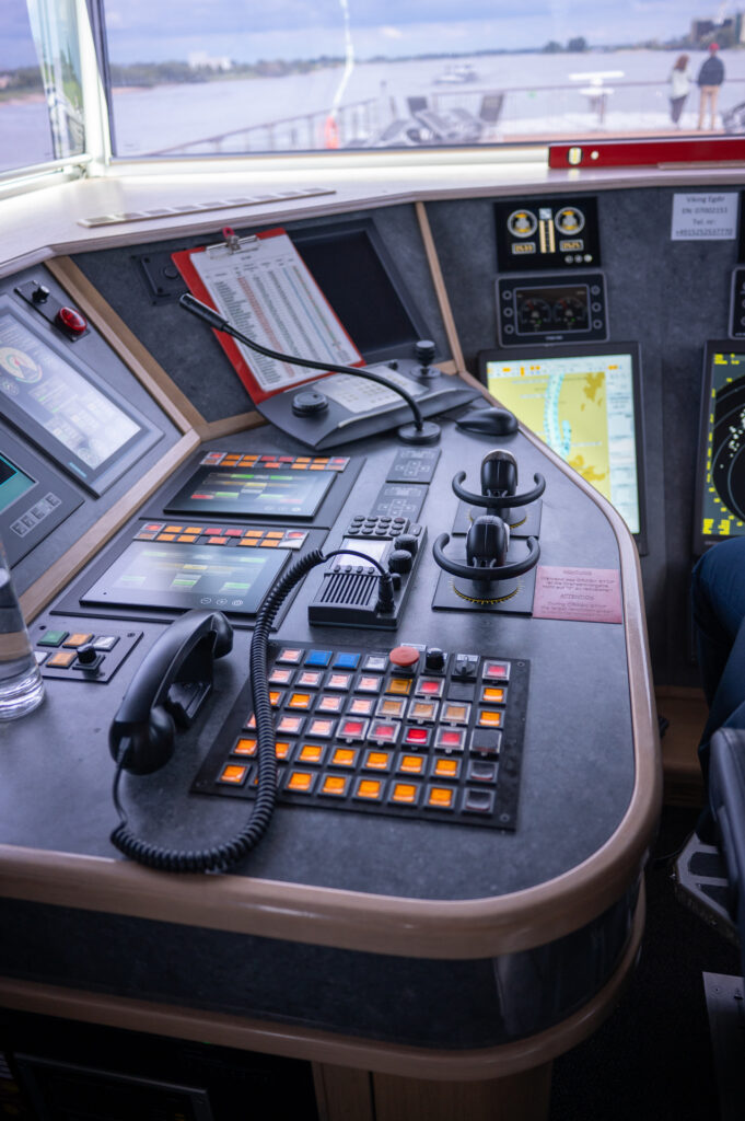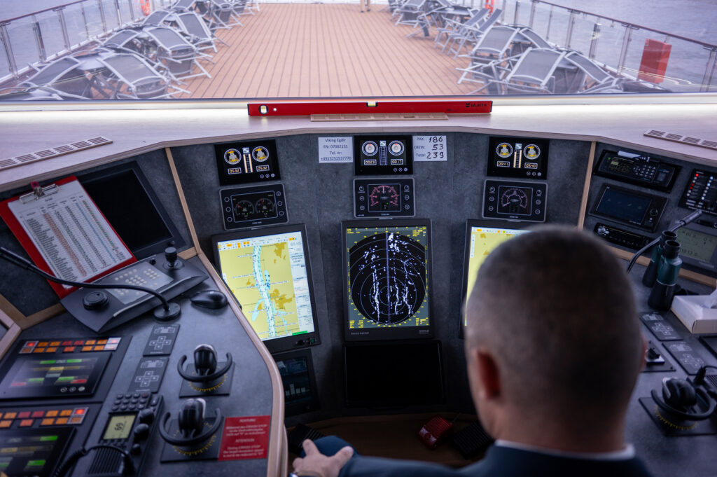 Later that afternoon Bill joined the Wheelhouse Tour. The Wheelhouse or ship’s bridge sits on the sundeck and can be lowered or raised using hydraulics. The Egdir is a relatively new ship with the latest electronic controls. However, note the red low-tech carpenter level used to monitor the side-to-side level of the ship as onboard passengers and cargo move.