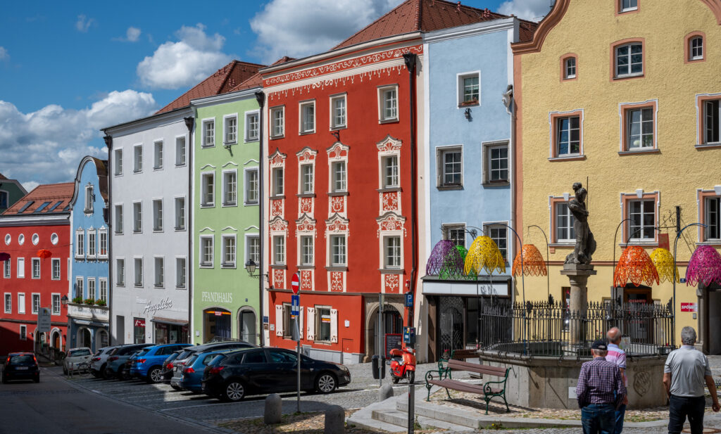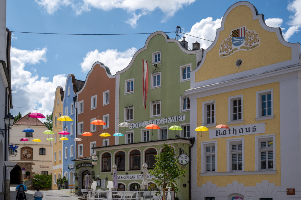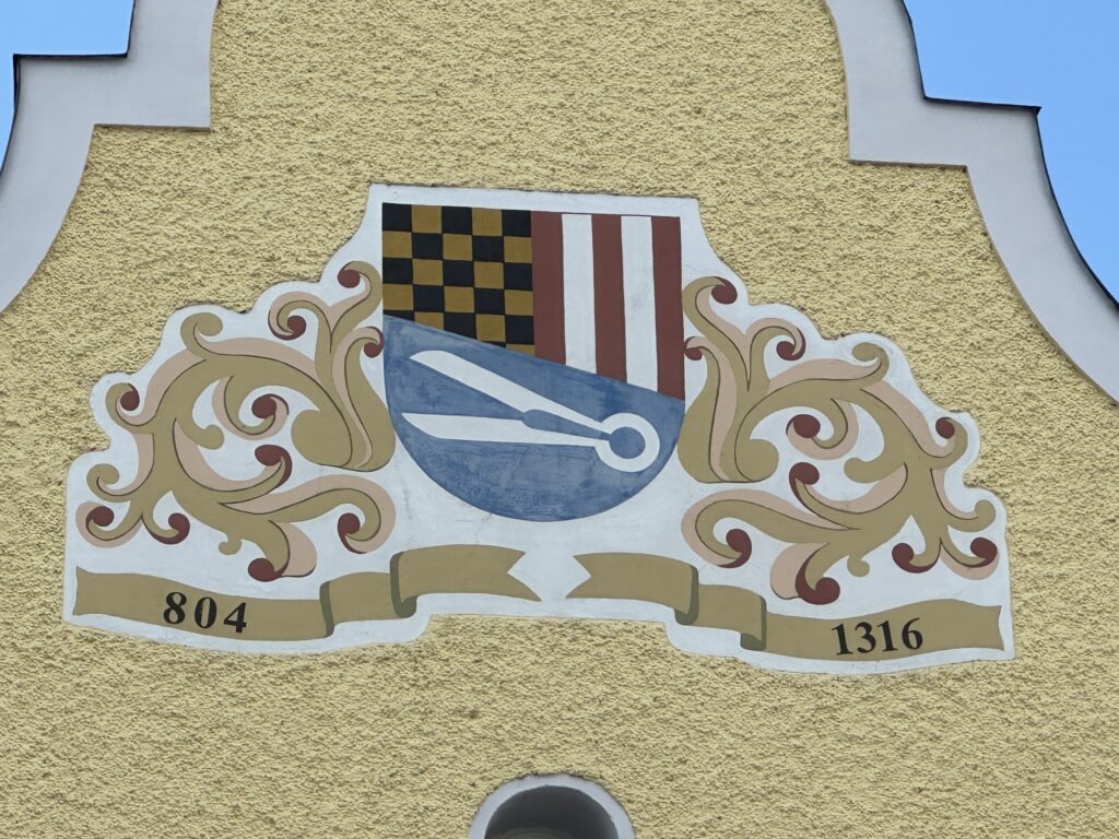 One of the most beautiful areas of the town is its central square with its rows of colorful, gabled buildings. The colors were associated with the professional guilds in the Middle Ages so that illiterate people would know the purpose of each building. For example, bakers were blue, butchers were red, hostels were green. Note the yellow Rathaus (Town Hall) in the photo below with the coat of arms of Schärding.