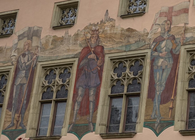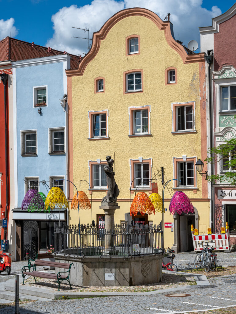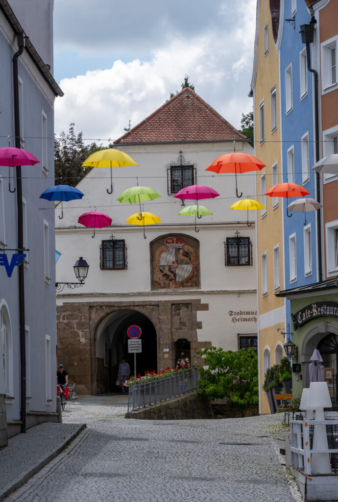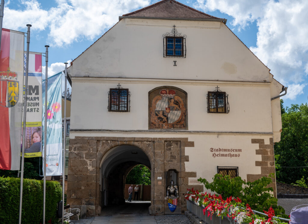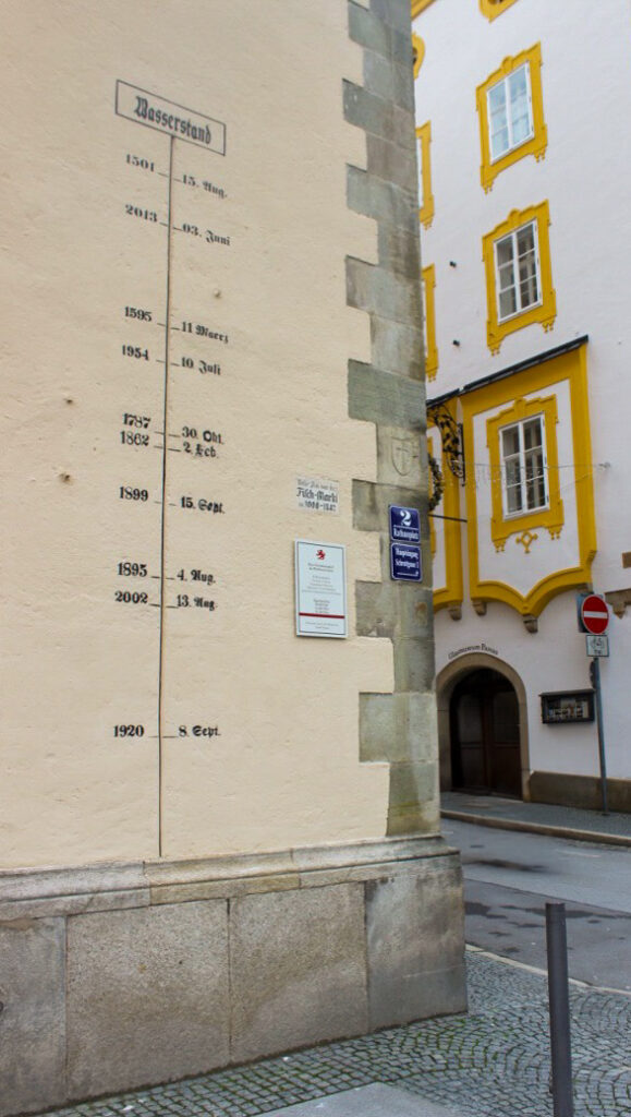 Originally the town was fortified. Sections of the wall remain, but the castle that was originally there is gone. We did see the castle gate that once housed the guards of the ducal palace. It now houses Schärding’s local museum. Until 1809, it was accessible only via a bridge across the outer moat. The older part of the building at the rear was originally four stories high. Made of tuff (rock composed of volcanic debris), it was once the outermost tower of the fortress built for Duke Ludwig the Bearded between 1428 and 1436.