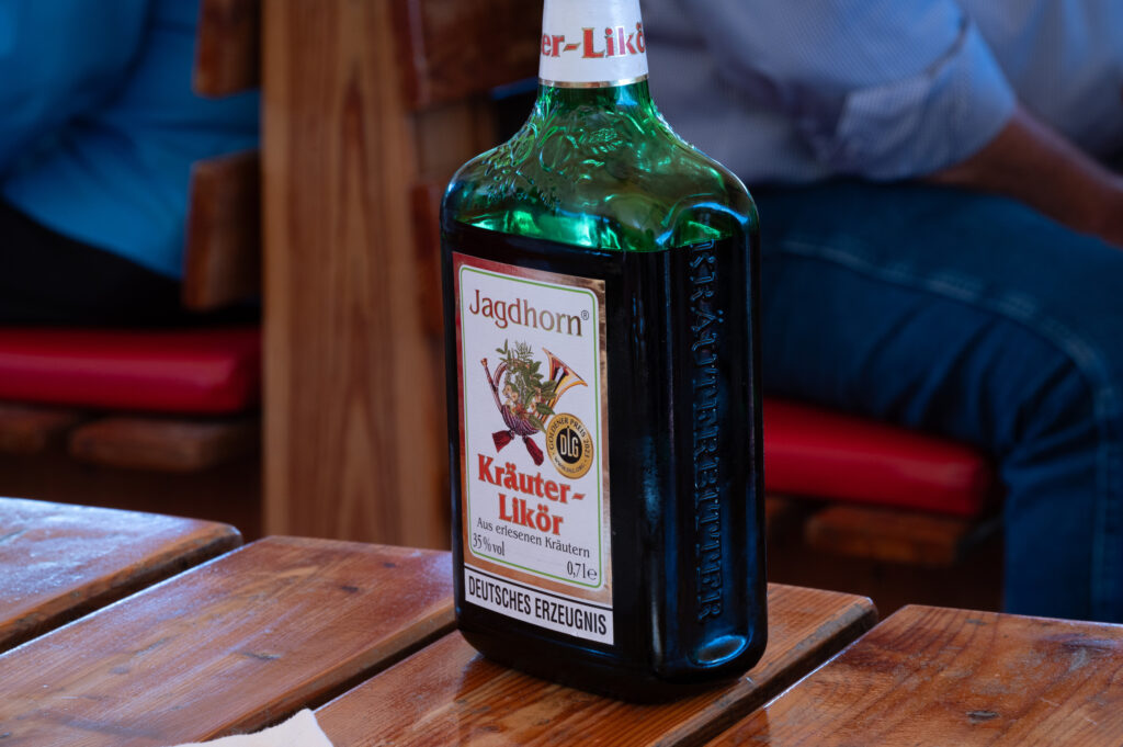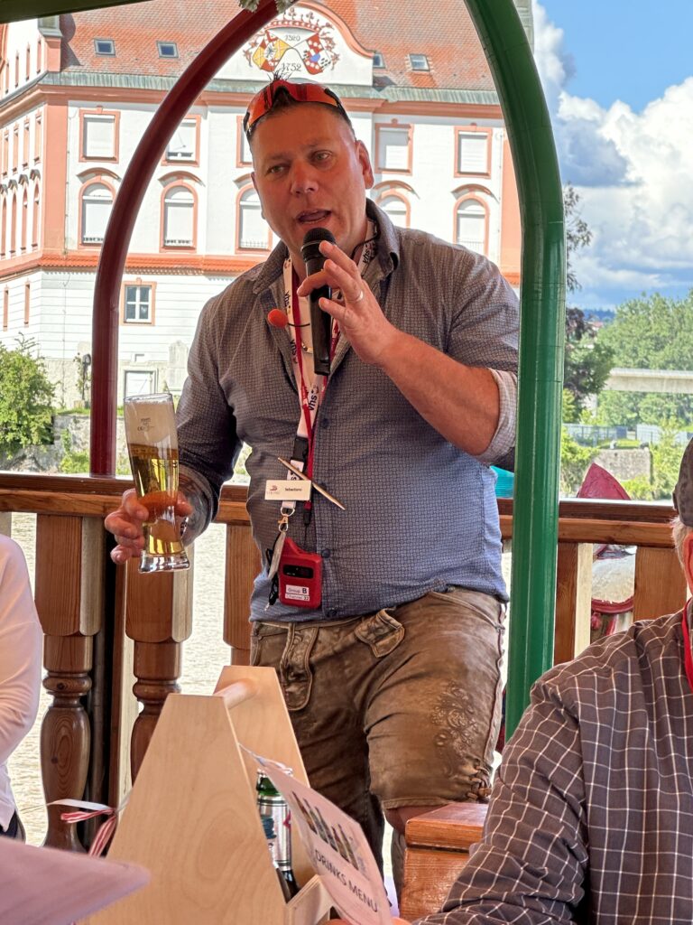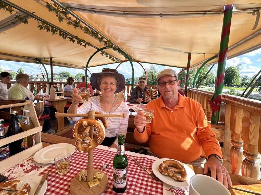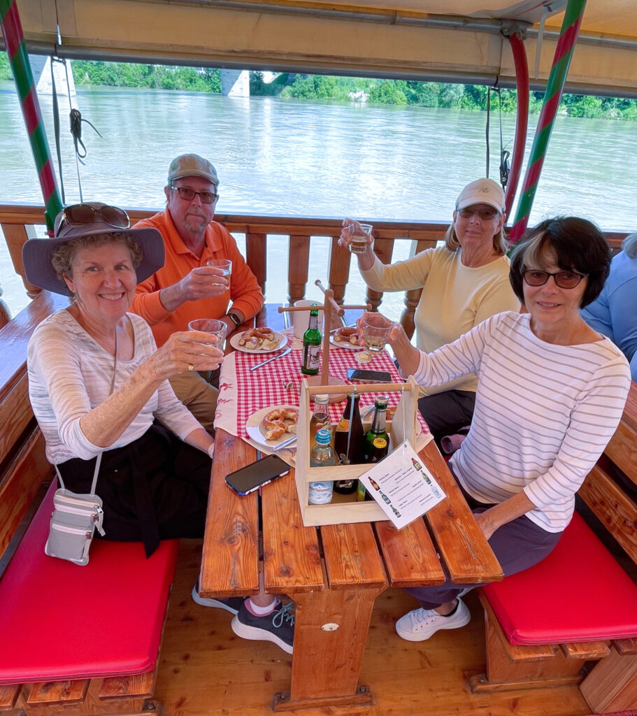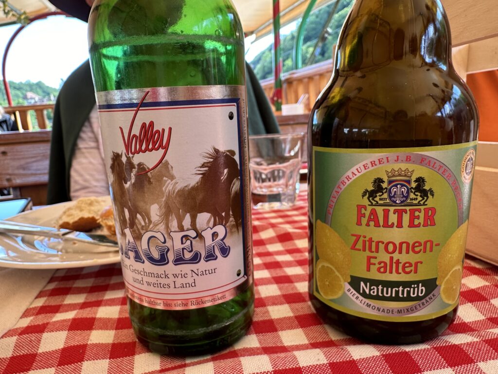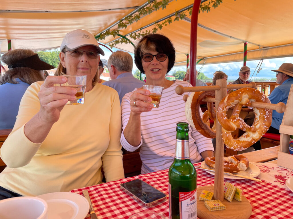 Once everyone passed the salt-making test, we were taken to the river where we boarded a boat for the scenic beer-tasting cruise. The boat easily accommodated our tour group with tables large enough for 4 – 6 people. On each table was a pretzel tree and a wooden box with 5 local beers. Each beer was different and we were told to try them all. At the end we were also offered shots of Jagdtraum Kräuterlikör (like a younger brother of Jägermeister).
