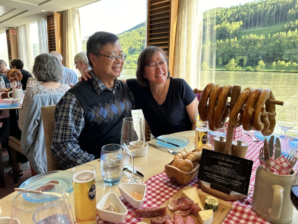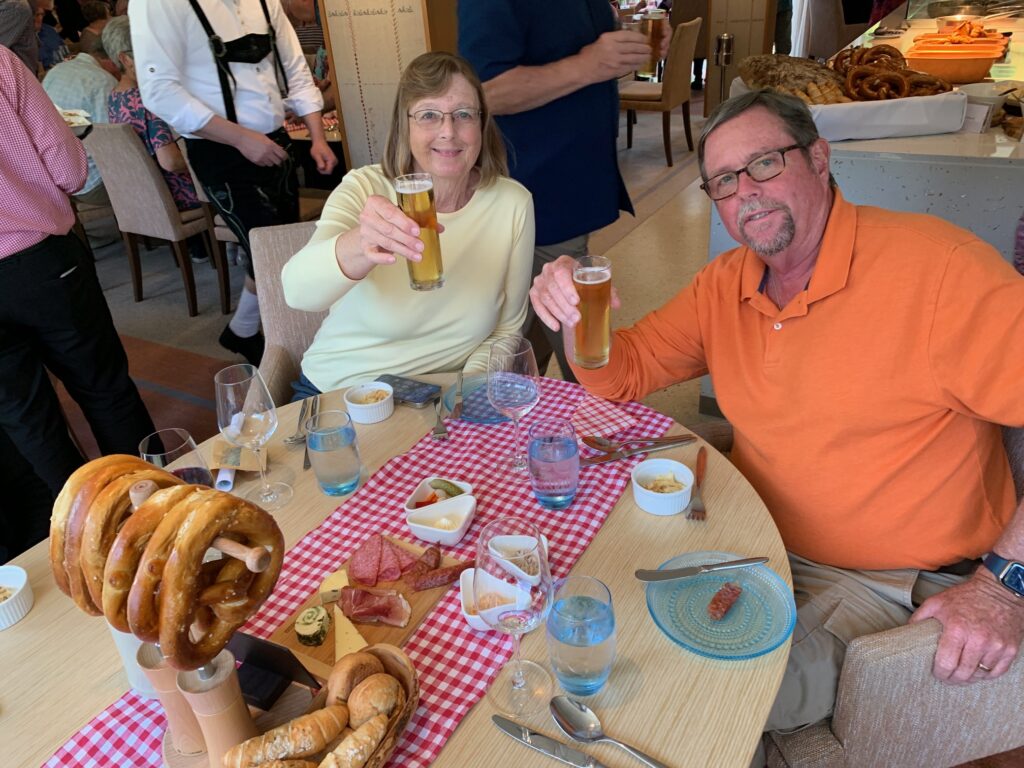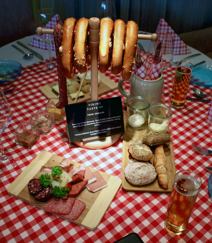 After our Bavarian cruise, we returned to the ship for a special German dinner. The evening started in the lounge with an introduction of some of the ship personnel wearing traditional German attire. They led us from the lounge into the restaurant where each table had a red or blue checkered table cloth and napkins plus a pretzel tree, bread board, meat selection, and German mustards. In addition to the salad, side dish, and dessert buffet we had a choice of