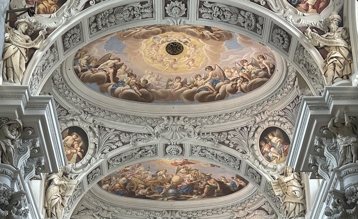 St. Stephen’s Cathedral is a baroque church built in 1688. Since 730, there have been many churches built on the site of the current cathedral. The current church, a baroque building around 100 meters long, was built from 1668 to 1693 after a fire in 1662 destroyed its predecessor, of which only the late gothic eastern side remains. The cathedral’s overall plan was made by Carlo Lurago, its interior decoration by Giovanni Battista Carlone, and its frescos by Carpoforo Tencalla.