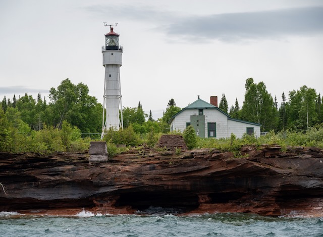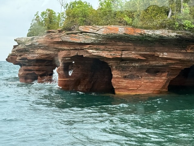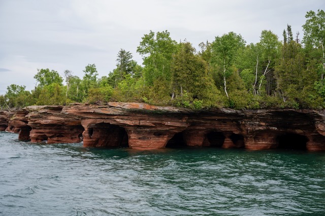 Since the only way to tour the Apostle Islands is via boat, we made reservations for the 55 mile narrated Grand Tour with Apostle Islands Cruises. As the weather was quite cool and windy, we opted to sit inside where the views were unfortunately limited. (Some folks braved the upper deck but paid the price where the water was rough.) The tour took us by Raspberry Lighthouse, Devil’s Island, Devil’s Island Lighthouse, and the Sea Caves.