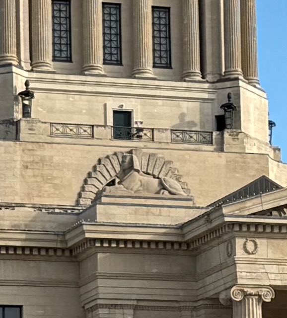 By the turn of the 20th century, plans for a bigger and more impressive government building were being made. When a design contest was put out around 1912, 66 entries came in from across the British Empire. English architects Frank W Simon and Henry Boddington III won with their Beaux-Arts Classical Design. Allegorical images of wisdom, strength, and power are spread throughout the building – and much of the material used was sourced from Manitoba. The yellow-brown bricks come from Portage la Prairie, the red bricks from Roseisle, and the limestone is (of course) Manitoba Tyndall stone, taken from the quarries in Garson.