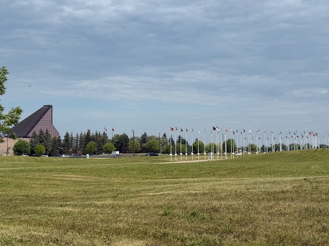 The building sits in a park-like setting, a triangular upthrust facing east. The shape is designed as a vertical contrast to the flat prairie horizon reminiscent of grain elevators, teepees, or mountains. It is the only “mountain” in Winnipeg. In front of the mint are up to 80 different international flags, representing the Mint’s extensive international clientele.