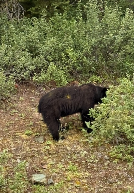 The drive from Banff to Jasper on the Columbia Icefields Parkway was breathtaking. Shortly after departing the Banff area, we encountered a wad of vehicles stopped in the right-hand lane – a sure sign of an animal sighting. Sure enough, somewhat hidden in the bushes was a bear (trust me, it was) grazing on berries. I managed a quick photo as we went by.