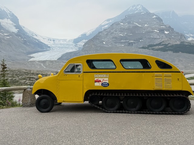 We had reservations for the Columbia Icefield Adventure Tour the day after we arrived, so we retraced part of our route on the Icefields Parkway to the Discovery Center. We had time to look around the Discovery Center and step outside for a look at the vehicle that was once used to drive on the ice and a view of the Athabasca Glacier.
